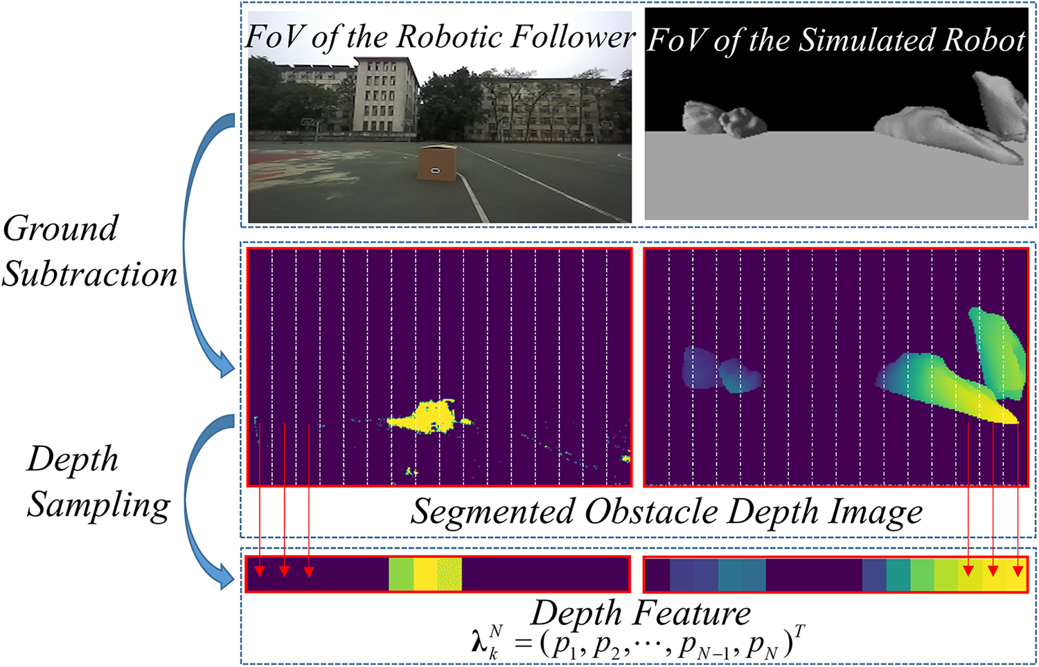 Techniques for stably following a human have seen increasing interest in social applications of family services, elderly care, and medical assistance. One intuitive method is to control the robot to directly approach the target person with the help of some vison-based perception techniques. 8 –10 For example, Pang et al. 8 employed a proportional-derivative (PD) controller to maintain a consistent distance and orientation relative to an identified human target. In a comparable study, an end-to-end controller was trained using deep reinforcement learning (DRL), making the robot a robust follower using only monocular images. 9 Besides, deep learning-based methods have also been applied, due to their high accuracy and speed of human detection, to improve the robot’s following robustness and efficiency. 11,12 These techniques featured simple control systems, nevertheless, have been limited to ideal conditions without the inclusion of obstacle avoidance. Recent efforts considering obstacle avoidance during human following have involved more complete following frameworks. Wu et al. implemented human following and obstacle avoidance modules separately, applying a priority decider for robot behavior coordination. 13 Yun et al. combined three artificial force fields in coordinating human following and obstacle avoidance. 14 By these methods, obstacle avoidance and target following of the robot were implemented independently, which might lead to the loss of optimality. For following path optimization, the issue can also be considered a path planning problem and addressed using combined global and local path planning algorithms. 15,16 For instance, Pang et al. utilized the A* 17 and timed elastic band 18 to identify optimal collision-free following paths for the robot. 15 However, path searching in the GPS-denied environment calls for real-time obstacle map construction based on 3D-LiDAR sensors, involving high power consumption and computational demand.