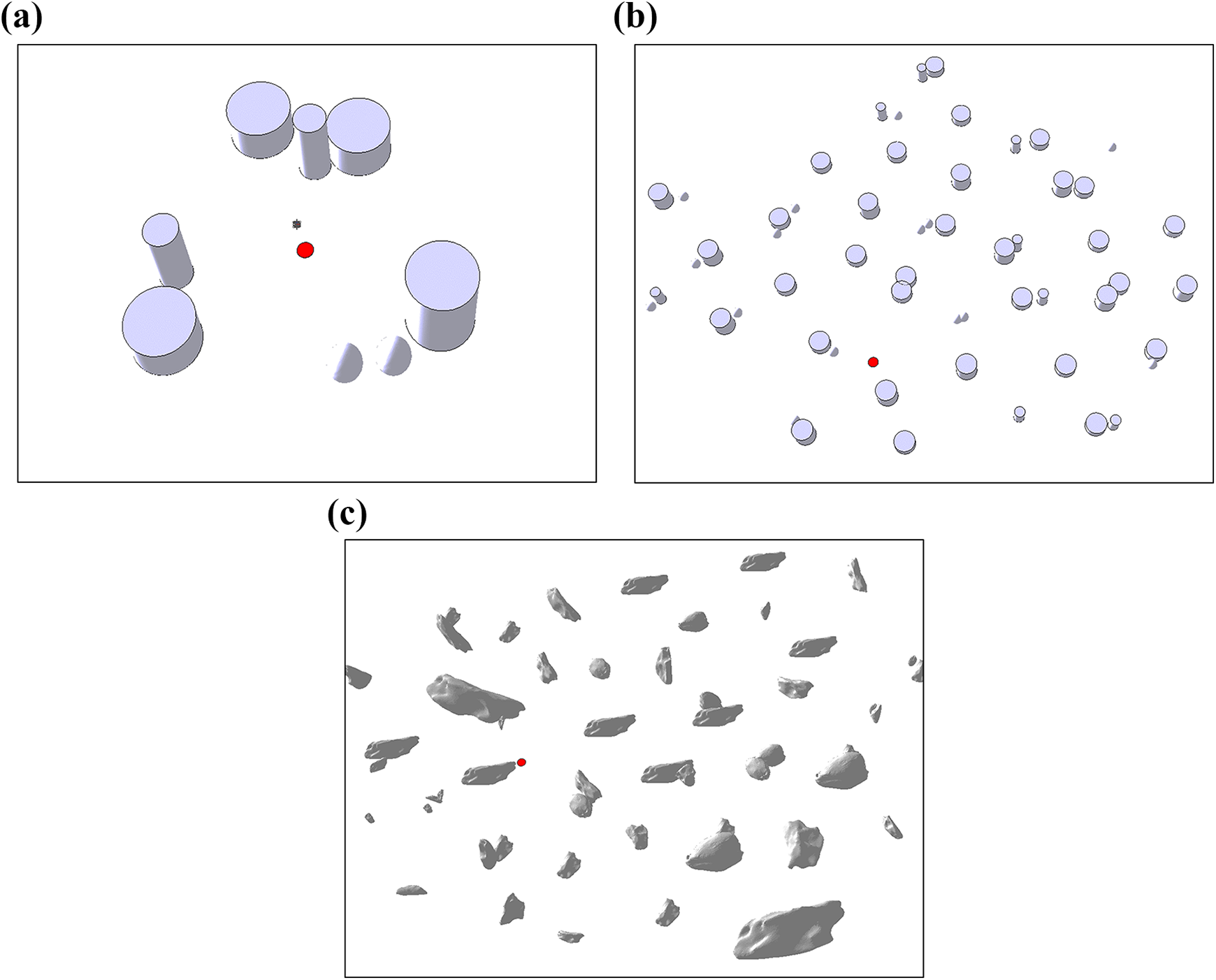 Obstacle environments used for navigator training and testing: (a) environment 1 for training, (b) environment 2 with regularly shaped obstacles, and (c) environment 3 with irregular rock-like obstacles.