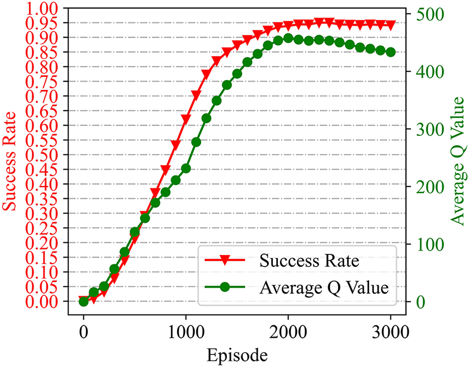 Training curves. The red curve is for success rate over the training episodes and the green for the average