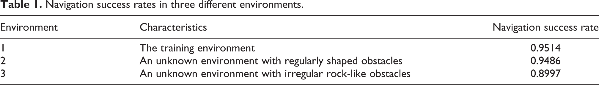 We conducted 1000 repetitive navigation tests in each environment to evaluate the adaptability of the navigator. It should be noted the navigator was no longer trained when applied to the two novel environments, relying solely on the model acquired during the previous training runs. The position of the robot and the guide point were randomly initialized at the beginning of each test episode. As shown in Table 1, the trained navigator adapted well to environment 2, with a high navigation success rate comparable to that of the training environment. What’s more, the trained navigator exhibited robust generalizability in environment 3, among rock-like obstacles with complex shapes and variable sizes.