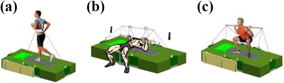 Structural scheme of the MAT: (a) Run training, (b) bench press training, and (c) deep squat training. MAT: multimodal astronaut training robot.