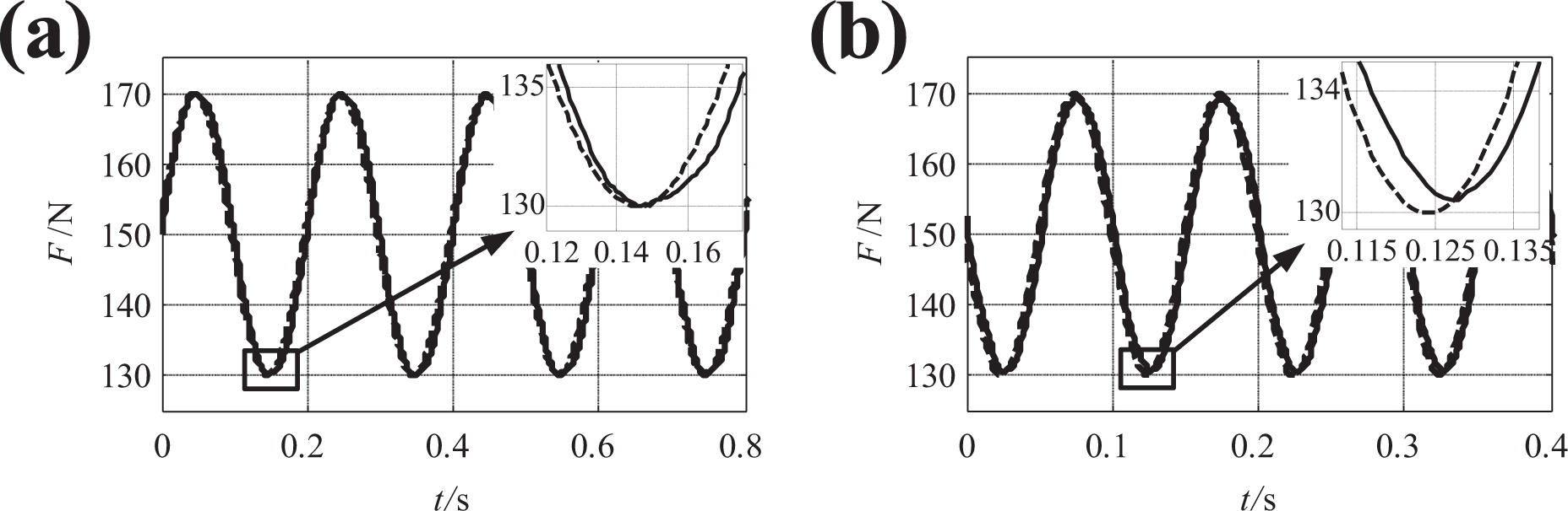 Tracking curve of the hybrid control (dotted line: expected force; solid line: actual force). (a) 5 Hz and (b) 10 Hz.