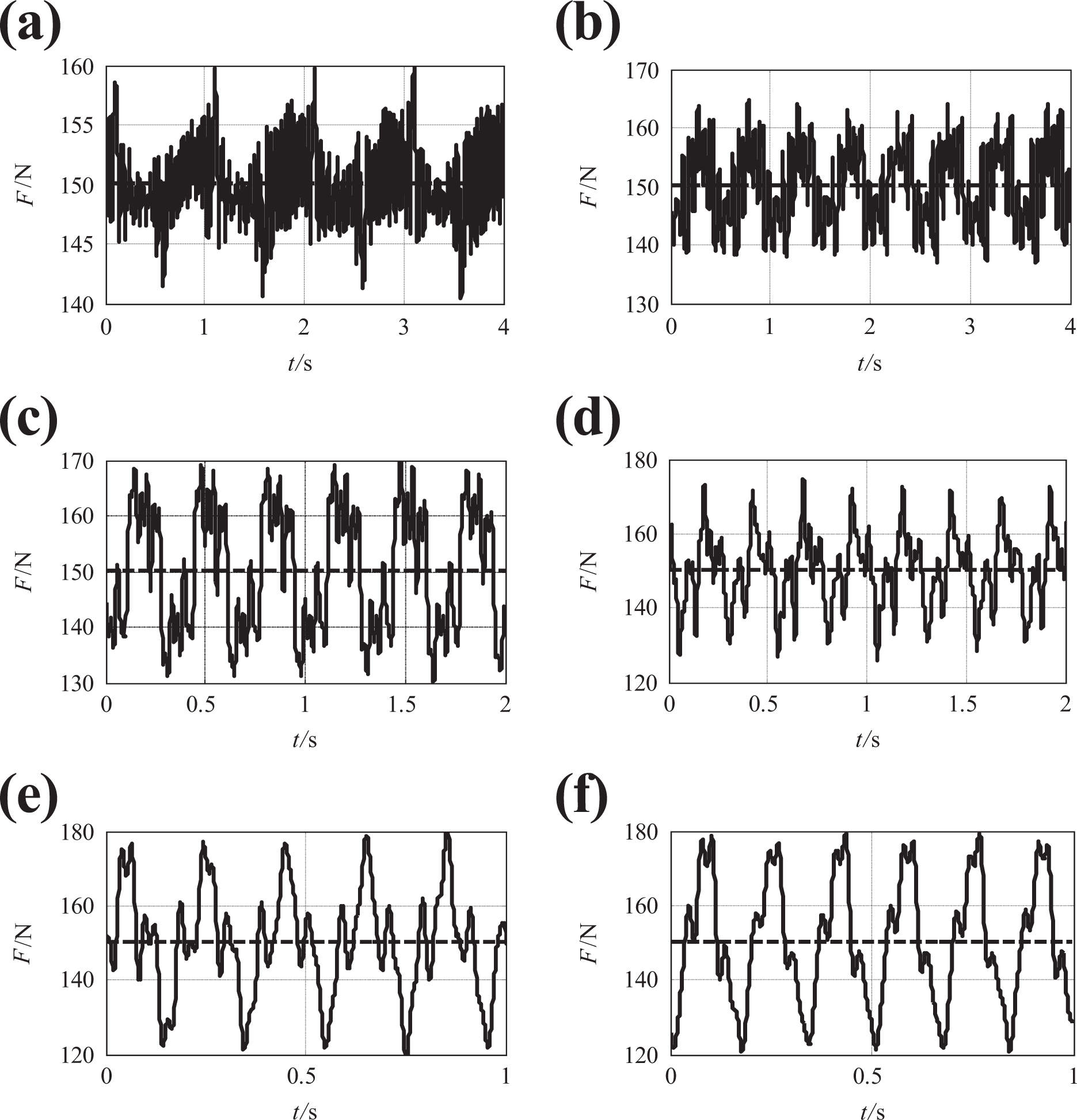 During the experiments, the control parameters of the surplus force compensation link were adjusted. The parameters of the surplus force compensator are finally determined as shown in Table 4. When the speed amplitude of the carrying unit is 0.3 m/s and the motion frequency changes from 1 Hz to 6 Hz, the experimental results of the passive force control experiments are shown in Figure 14. The expected force loaded on the carrying unit is 150 N indicated in Figure 14 by dotted lines. The solid line represents the actual loading effect. The deviation of actual force from expected force is mainly caused by the movements of the carrying unit, that is, the surplus force. The statistical results of actual system surplus force elimination rate are shown in Table 5. The experimental results show that the designed passive force control strategy can effectively reduce the surplus force.