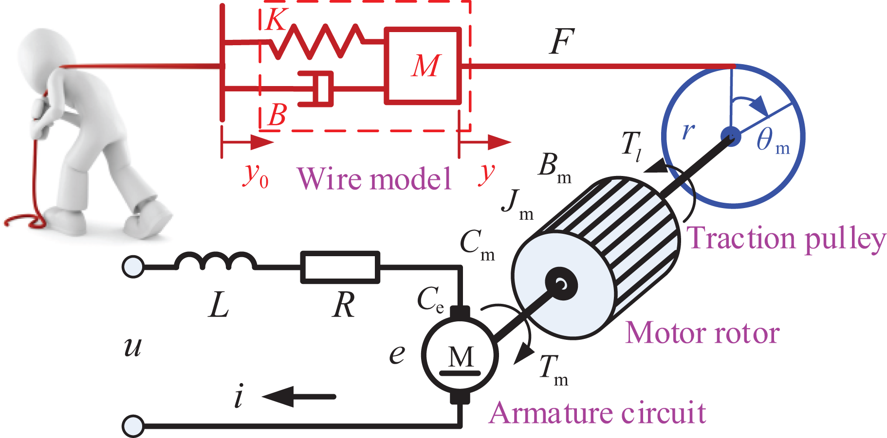 According to the equations (1) to (5), the block diagram of the open-loop wire driving force servo system is shown in Figure 4 on considering the influence of the carrying object motion. Two inputs affect the output wire traction