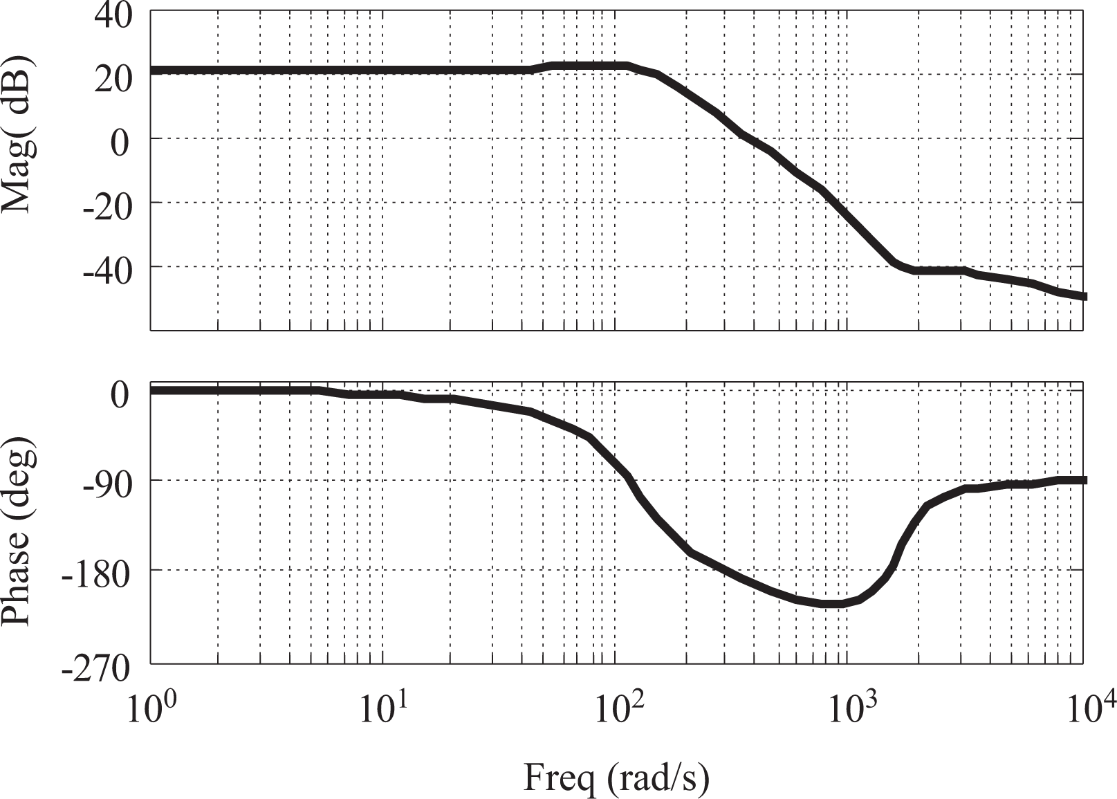 Figure 5 is the frequency response of the forward channel. In the low-frequency range, the amplitude frequency response curve of the system is straight enough without correction; the phase frequency response exhibits hysteresis characteristics, the system phase lags approximately 35° at 10 Hz (62.8 rad/s).