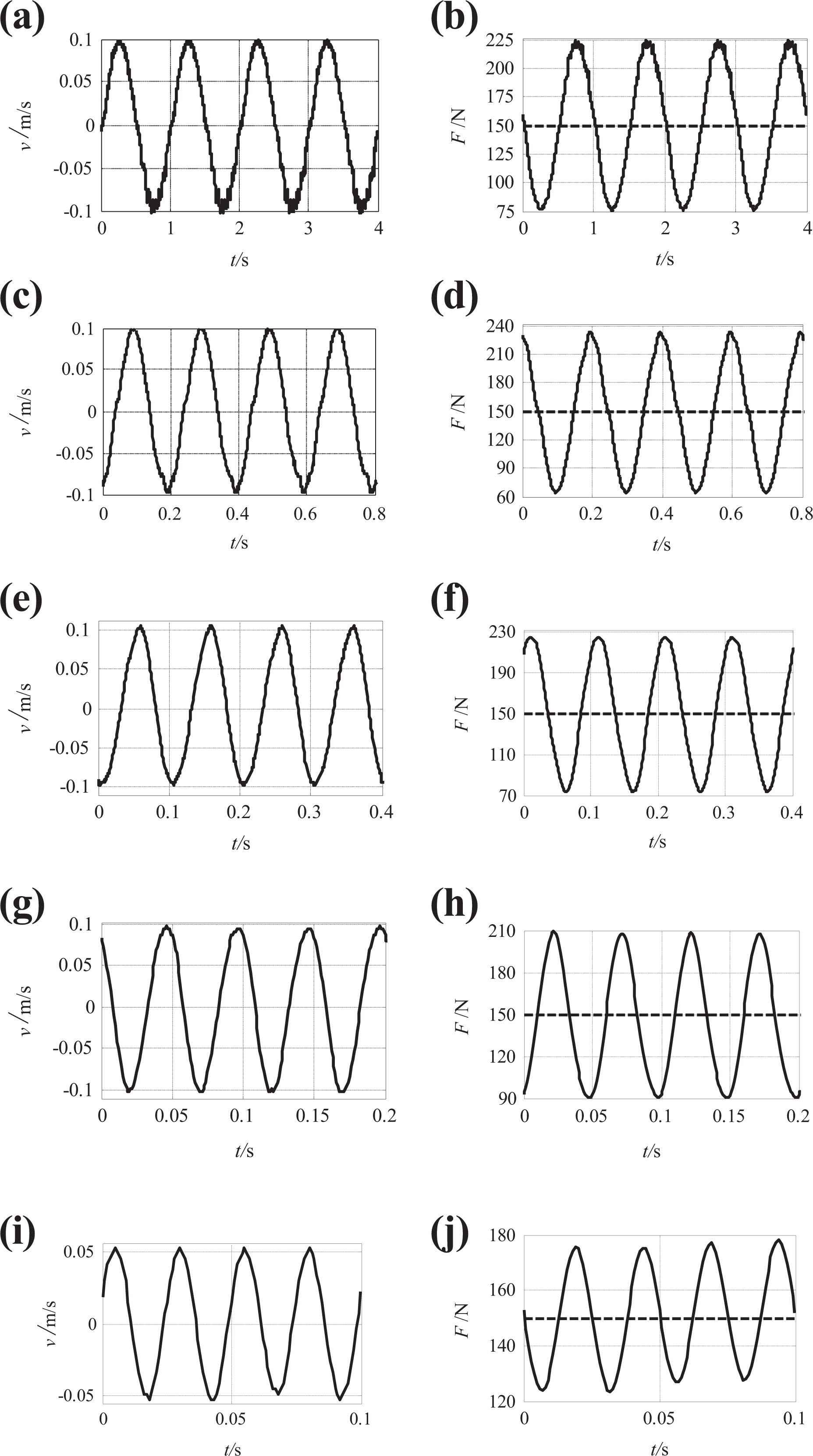The surplus force of the cable driven unit at different speed.(a) 1 Hz speed disturbance, (b) 1 Hz surplus force, (c) 5 Hz speed disturbance, (d) 5 Hz surplus force, (e) 10 Hz speed disturbance, (f) 10 Hz surplus force, (g) 20 Hz speed disturbance, (h) 20 Hz surplus force, (i) 40 Hz speed disturbance, and (j) 40 Hz surplus force.