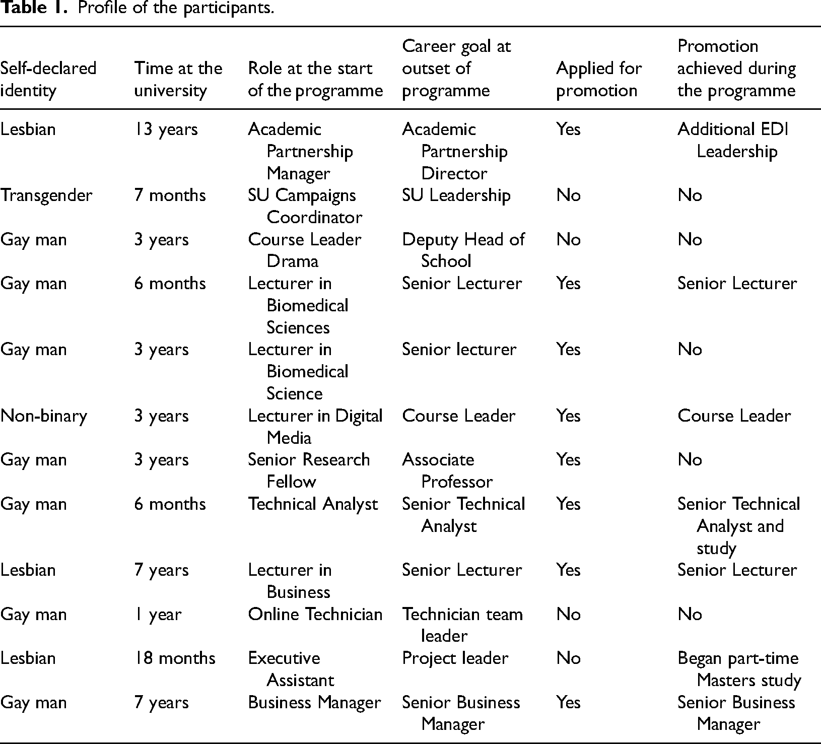 Table 1 presents a profile of each of the 12 participants and includes their identity, their length of time at the university, their role, career goal and details of promotion sought and achieved.