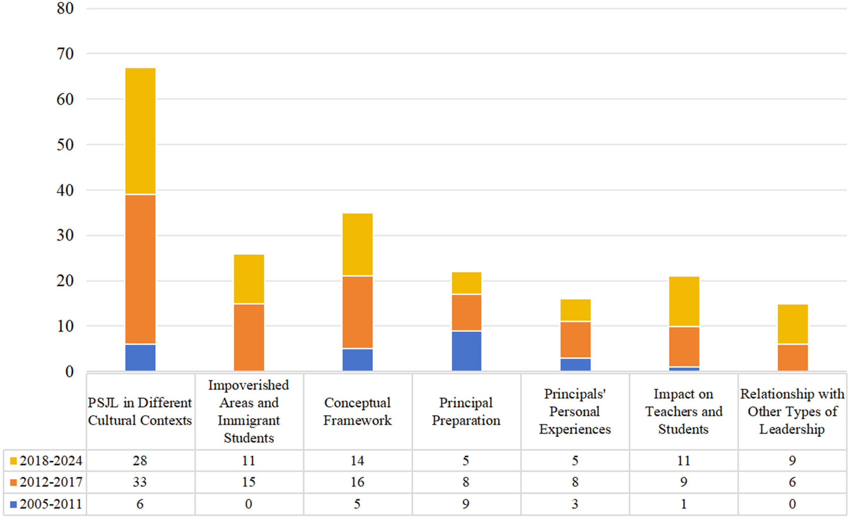 The geographic distribution of PSJL studies reflects the contributions of key scholars. In the United States, Brown (2005), Normore and Jean-Marie (2008), and Theoharis (2007) explored issues of equity, race, and leadership practices in American schools (Brown, 2005; Normore and Jean-Marie, 2008; Theoharis, 2007). Dematthews and Izquierdo (2016, 2017) focused on social justice leadership along the United States–Mexico border, particularly immigration policies and bilingual education. Outside the United States, scholars contributed to social justice leadership research in various regions. For example, Szeto (2014) studied social justice leadership in Hong Kong, Zembylas and Iasonos (2016) focused on leadership in Cyprus, Arar (2015) examined Arab school leaders in Israel, and Slater et al. (2017) contributed to cross-national comparative studies on PSJL.