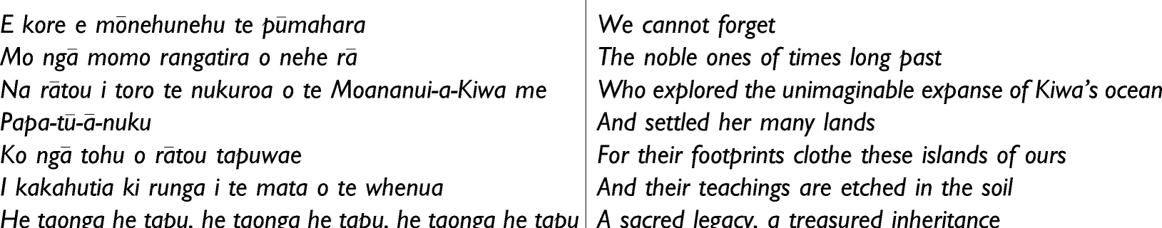 In Māori philosophy, interconnections between concepts such as time and space are often distinguishable through context rather than as disparate phenomena (Smith, 1999, 2012). It is the ongoing relationships and histories impressed upon our understandings of time and space that matter most. By virtue of their ever-unfolding nature over time, the power and agency of place is affirmed as an entity that creates, reminds, hosts, empowers, responds and receives. Caring for and maintaining ancestral relationships rests on the community to name, remember and enact stories of belonging through song, prayer and oral history held in collective memory (Archibald, 2008; Mahuika, 2012).