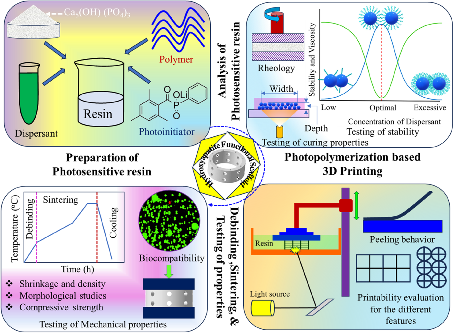 The requirement for functional scaffolds made from hydroxyapatite-based materials is gaining importance in bone tissue engineering (BTE) due to their ability to provide mechanical behaviour similar to that of native tissue. Additive manufacturing (AM) via vat photopolymerisation (VPP) has been demonstrated to be a superior choice for fabricating FS, as it offers enhanced mechanical strength to support intricate structures with high printing resolution compared to other 3D printing methods. The current work presents a detailed review of different VPP AM processes to manufacture hydroxyapatite-based scaffolds for bone tissue engineering. The roles of various monomers, photoinitiators, and dispersants, as well as their impact on printability and the resulting scaffold properties, were elucidated. In addition, the debinding and sintering processes of scaffolds are elaborated. This review helps researchers and practitioners understand the latest advancements in VPP AM processes, photocurable resin technologies, and selection strategies for developing HAp scaffolds for BTE.