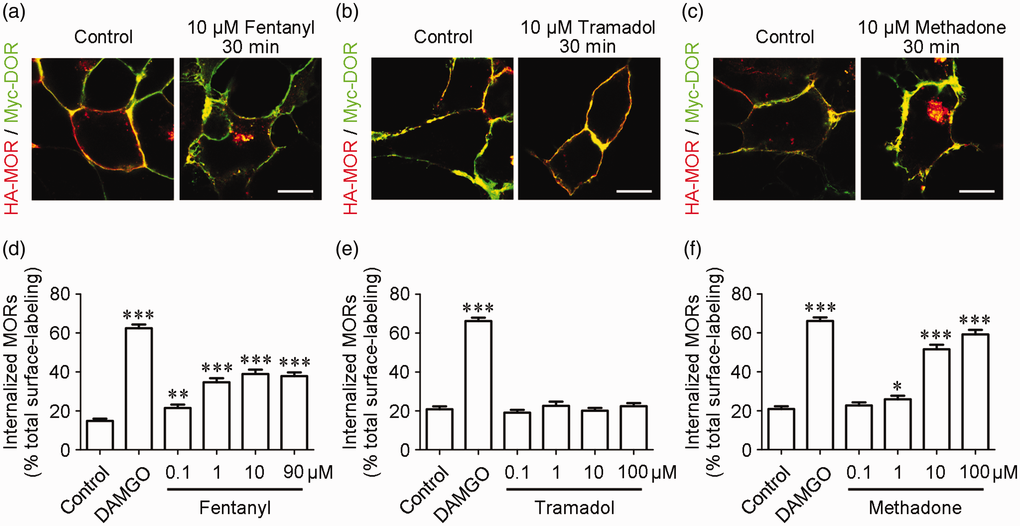 Clinical MOR-targeting opioids induce co-internalization of MORs with DORs. HA-MOR and Myc-DOR expressed on the cell surface were pre-labeled with antibodies against HA (red) and Myc (green) in living HEK293 cells and then treated with opioid drugs for 30 min ((a)–(c)). Quantitative data of internalized MORs were calculated from the intensities of intracellular immunofluorescence versus the total immunofluorescence ((d)–(f)). In HEK293 cells co-expressing MOR/DOR, a 30-min treatment with fentanyl and methadone, but not tramadol, induced MOR co-internalization with DORs in a dose-dependent manner similar to morphine. DAMGO (1 μM) was chosen as a positive control for inducing MOR internalization. The results are presented as the mean ± SEM (n = 80–100 cells). Scale bar, 10 μm. *p < 0.05, **p < 0.01, and ***p < 0.001 versus the corresponding control group.