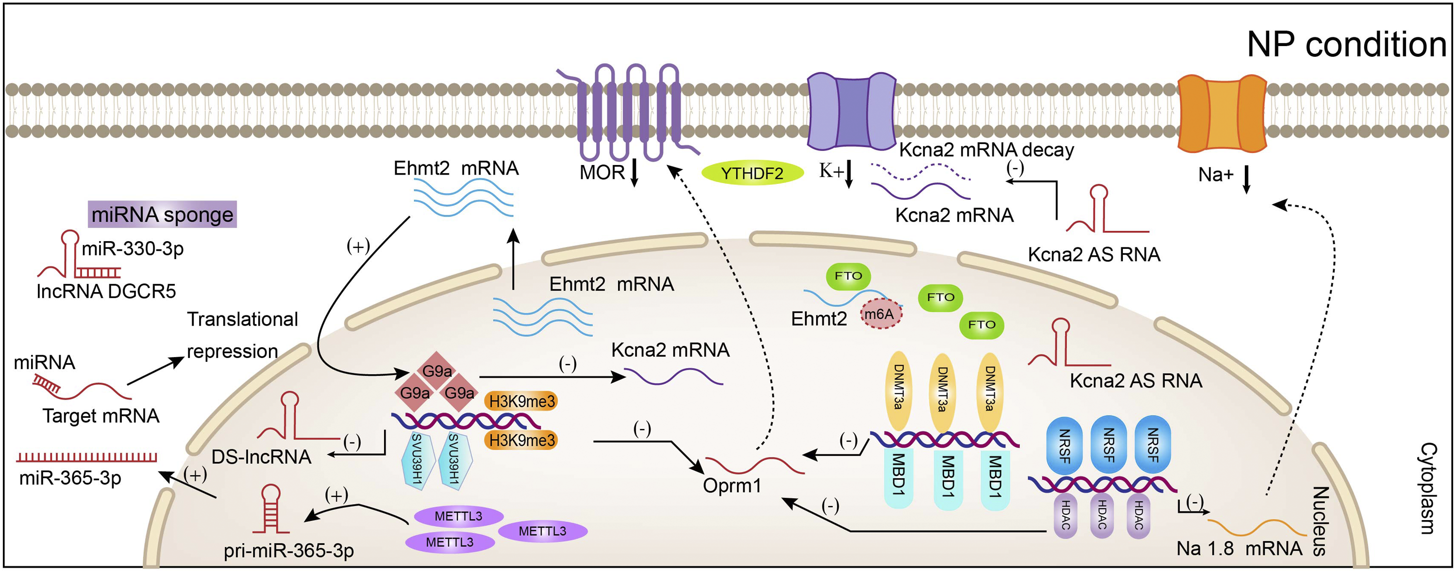 DNA methylation of gene promoters is generally associated with gene silencing. Upregulation of DNMT is associated with increased methylation of the MOR gene promoter in the DRG and spinal cord, leading to downregulated opioid receptor expression. This reduced expression usually leads to undesirable opioid analgesic effects in NP.76,81 In addition, DNA methylation represses gene transcription by serving as docking sites for transcription repressors, such as the family of methyl-CpG-binding domain (MBD) proteins, including MBD1-4 and MeCP2.