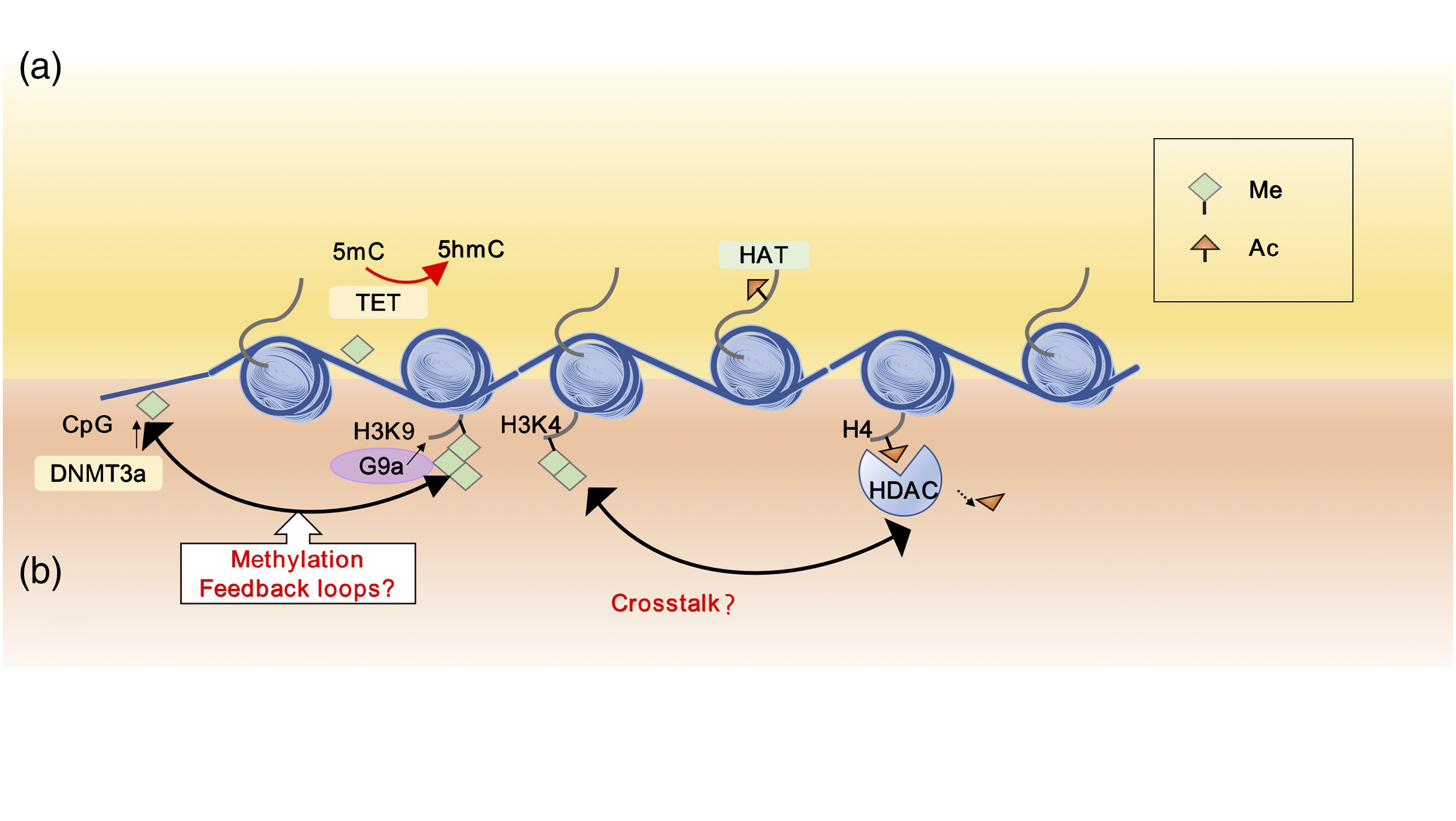 Crosstalk between different modifications of gene regulation has been shown to play a key role in epigenetics. It has been reported that DNA methylation and several covalent histone protein post-translational modifications have a highly interactive effect rather than simply acting under harmful stimuli.117,118 Histone modification can also positively or negatively affect other modifications.23,119–121 Endogenous DNMT3a could interact with histone methyltransferase SUV39H1 enzymes, leading to gene silence. Moreover, G9a seems to act in concert with SUV39H1.122,123 In NP models, Crosstalk between different epigenetic layers. Chromatin is typically marked by multiple modifications. Crosstalk between these epigenetic marks may work in concert in the process of NP development and progression. (a) Crosstalk enforcing in gene activation. DNA demethylation mediated by Ten-eleven translocation (TET) protein and histone acetylation lead to gene activation. (b) Crosstalk resulting in gene silencing. DNA methylation and histone methylation could lead to gene silencing, and they may have multiple feedback loops to regulate the gene transcription.