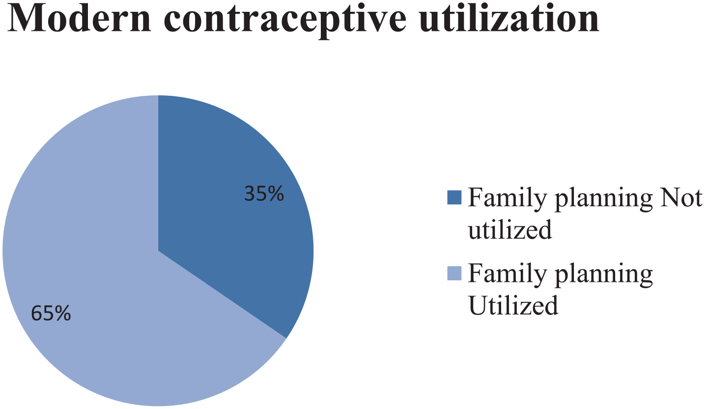 This study revealed that approximately 65%, 95% CI (59.8, 70.8), of the women utilized modern contraceptive methods (Figure 1).