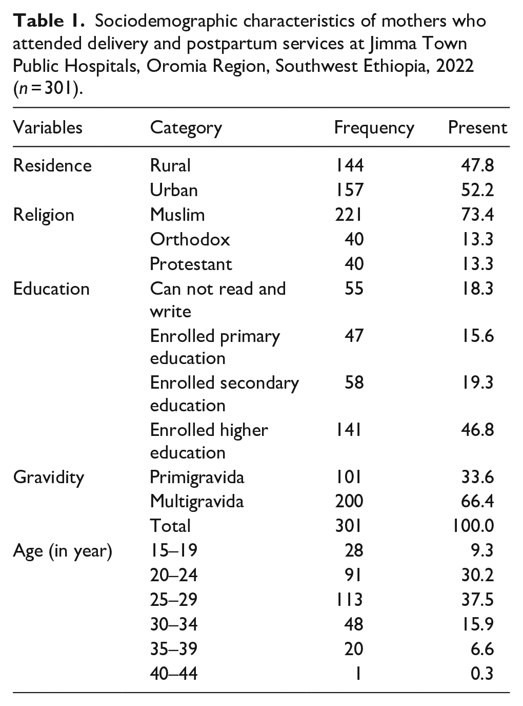 Sociodemographic characteristics of mothers who attended delivery and postpartum services at Jimma Town Public Hospitals, Oromia Region, Southwest Ethiopia, 2022 (