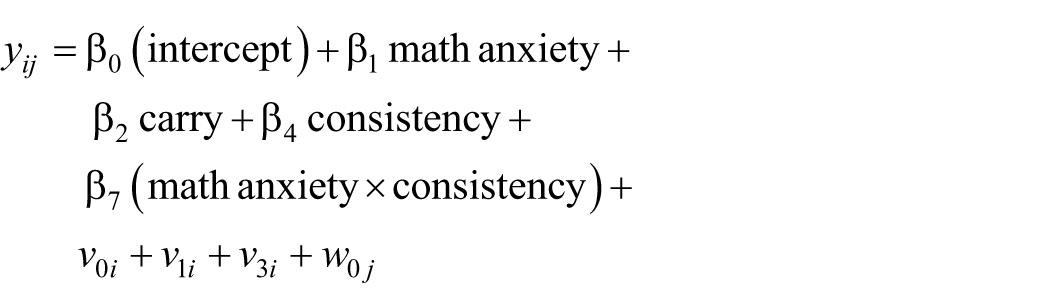 Regarding modeling, we first built the full model with the maximal possible random effect structure, as recommended by Barr et al. (2013). This included random intercepts for participants and items, as well as random slopes for operation, carry/borrow, and lexical consistency, because these factors could cause random variation across participants. 5 Thus, the full model was