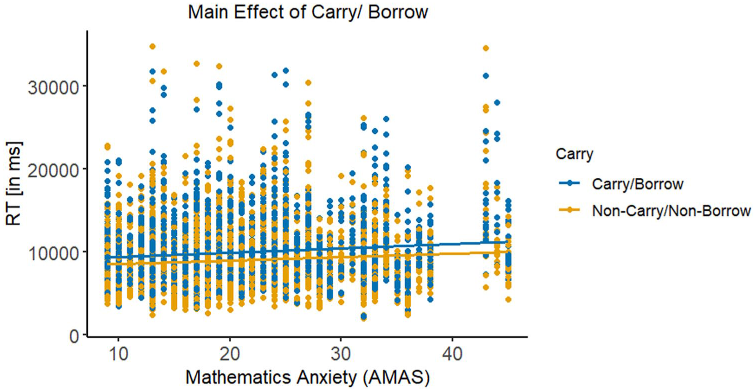 Arithmetic difficulty was not affected by math anxiety in the context of word problems. First, math anxiety did not differentially affect the arithmetic operations addition and subtraction, replicating a previous finding from basic arithmetic (Huber & Artemenko, 2021). However, math anxiety did also not differentially affect the carry and borrow effects in arithmetic – and this contrasts with findings in basic arithmetic tasks, where math anxiety particularly impaired arithmetic performance when addition needs carrying and subtraction needs borrowing (Ashcraft, 2002; Ashcraft & Kirk, 2001; Chan & Tang, 2020; Faust et al., 1996; Huber & Artemenko, 2021; Hunt et al., 2014; Hunt & Sandhu, 2017). In the context of word problems, the anxiety-complexity effect could not be replicated in this form, suggesting that the carry/borrow operations are difficult per se, independent from the individual math anxiety level. While arithmetic difficulty due to carry and borrow operations slows down performance, the effect is not moderated by math anxiety, indicating that the anxiety-complexity effect does not generalize to carry/borrow operations in word problem contexts.
