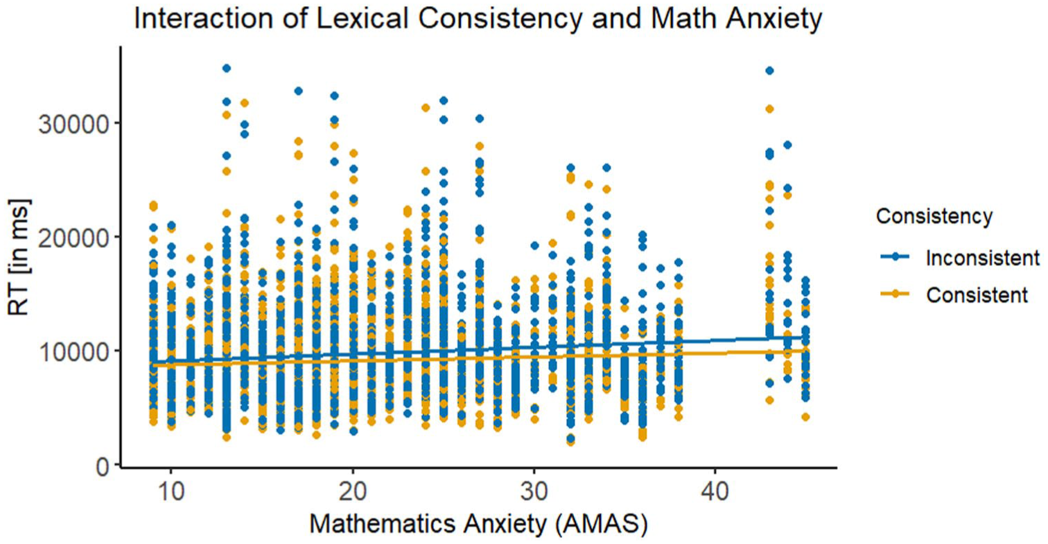 The reduced model indicates that word problems with a carry or borrow operation need longer to be solved than word problems without these operations (see Figure 1). Moreover, an interaction between math anxiety and consistency was observed: the consistency effect varied as a function of math anxiety, with higher levels of math anxiety being associated with a larger lexical consistency effect (see Figure 2).