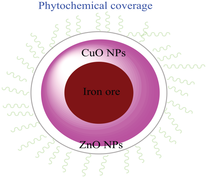 The ZnO@CuO@Iron ore nanocatalyst consisting of the natural iron ore substrate, CuO NPs, ZnO NPs, and a covering of plant phytochemicals on its surface.