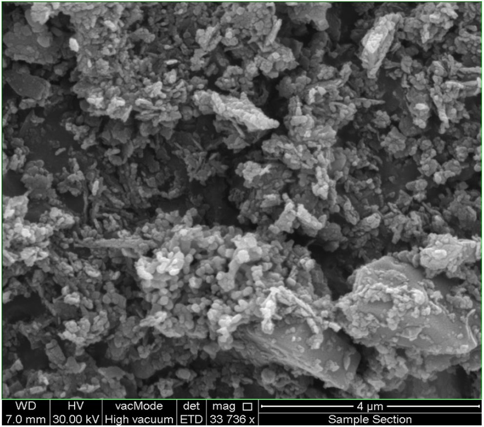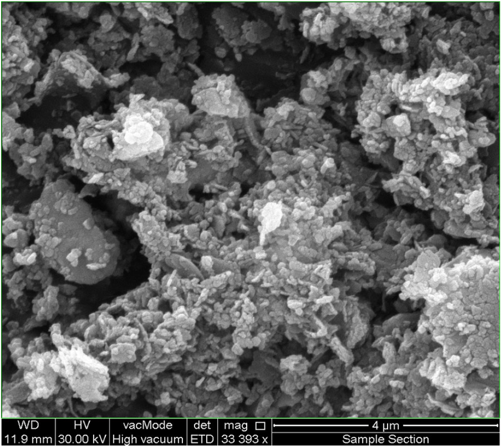Furthermore, the SEM micrograph shown in Figure 5 demonstrates a nanosized system (mostly in the range of 50–70 nm) for the