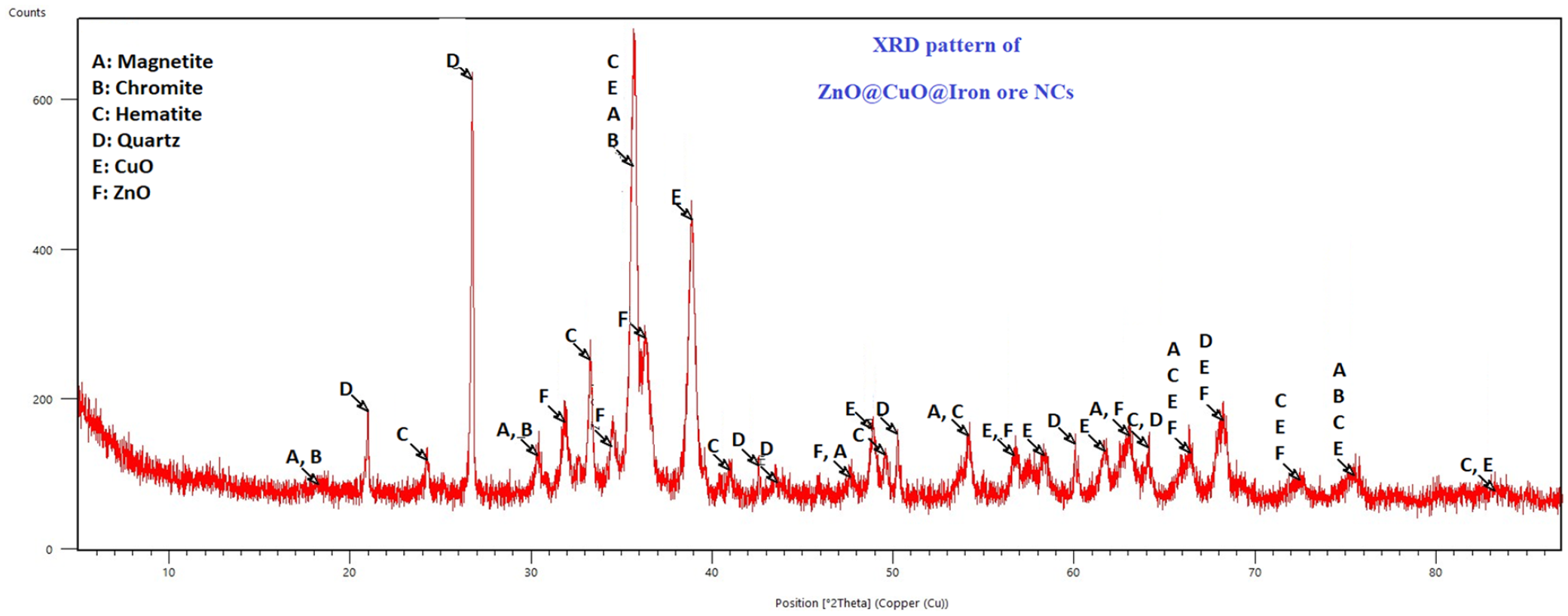 The XRD diffractogram of the ZnO@CuO@Iron ore NCs.