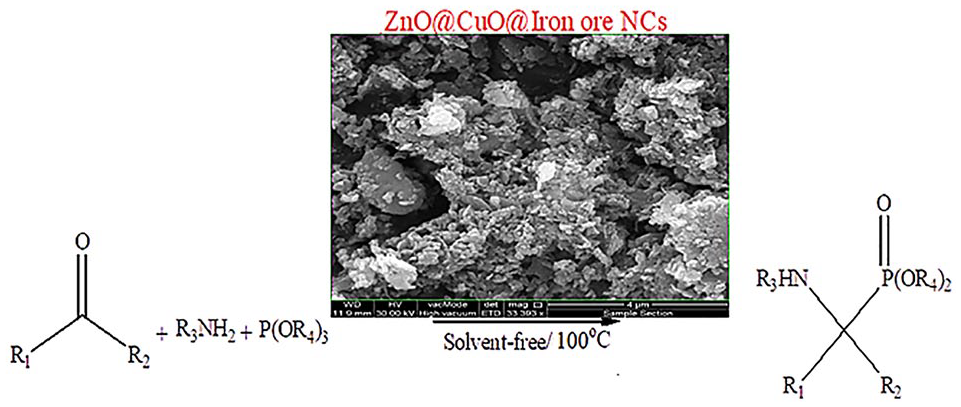 Due to the significance of α-aminophosphonates in medicinal and pharmaceutical applications, the development of novel, fast, and safe synthetic methodologies, especially using heterogeneous catalysts with important economic properties, is of great importance. This study has introduced a potent and green synthesized ZnO@CuO@Iron ore nanocatalyst which can be used for the synthesis of α-aminophosphonates by treatment of aldehydes or ketones with amines and trialkyl phosphites. The catalyst benefits from a large surface area, a phytochemical coating on its surface acting as a capping agent, and a multi-mineral system acting as a Lewis acid. Therefore, in view of its easy recovery, eco-friendliness, good reaction rates, high yields, and better performance compared to previously reported catalytic procedures for the synthesis of α-aminophosphonates, this method has significant advantages. In addition, the syntheses are solvent-free and involve short reaction times and a simple work-up procedure.