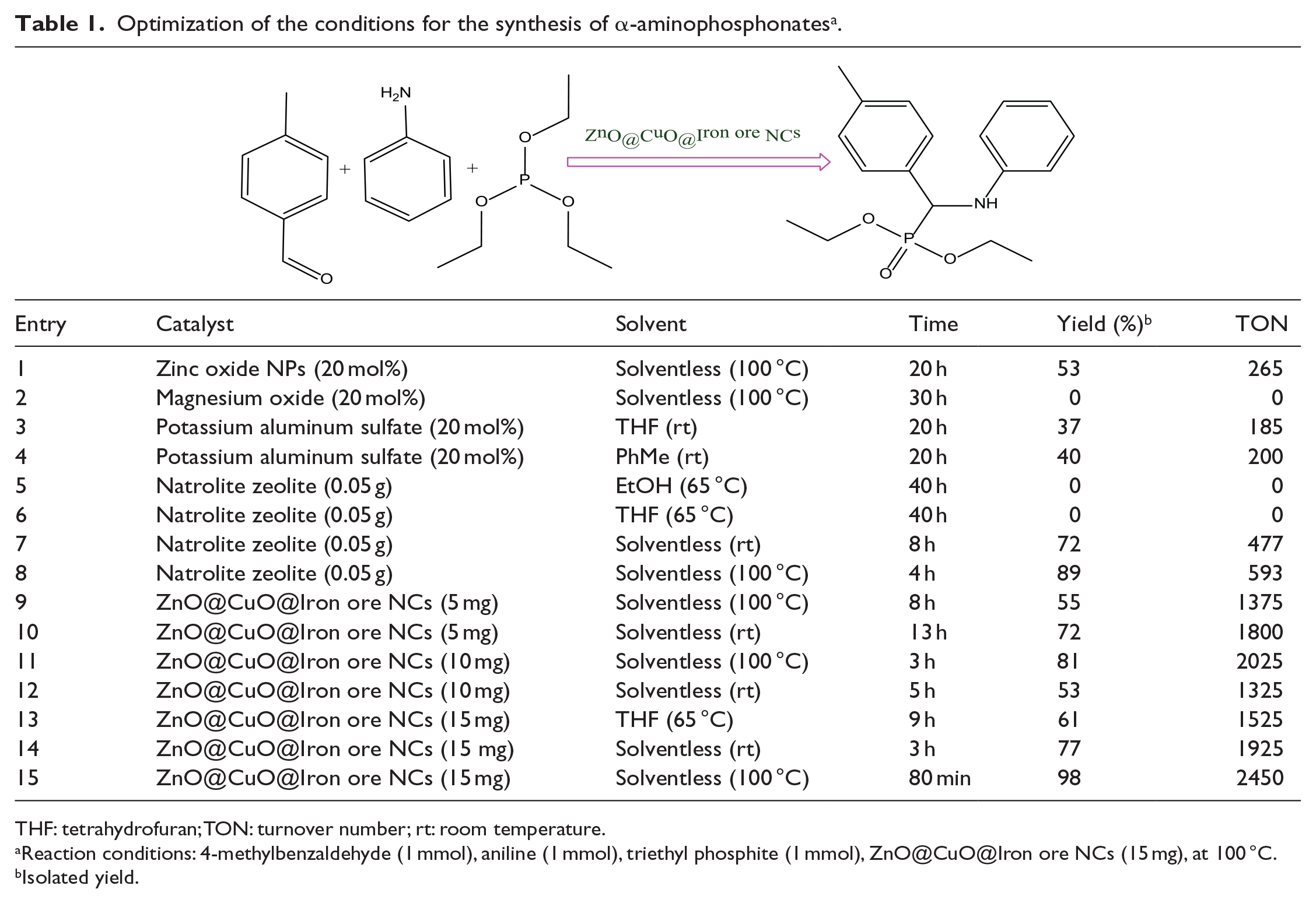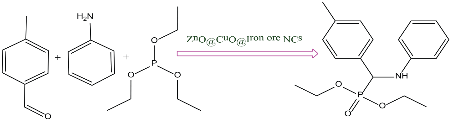 Reaction conditions: 4-methylbenzaldehyde (1 mmol), aniline (1 mmol), triethyl phosphite (1 mmol), ZnO@CuO@Iron ore NCs (15 mg), at 100 °C.