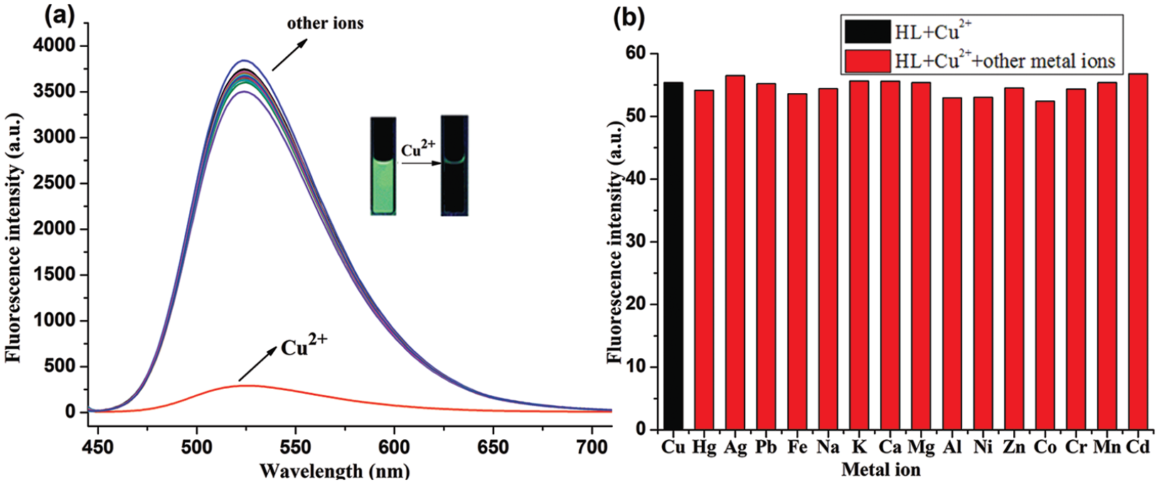 The performance ability of an ideal chemosensor is greatly influenced by its selectivity parameter. Therefore, the binding properties of HL with various metal ions (Na+, K+, Ca2+, Mg2+, Al3+, Pb2+, Fe3+, Ni2+, Zn2+, Hg2+, Ag+, Co2+, Cr3+, Mn2+, Cd2+, and Cu2+) were systematically investigated by performing selectivity and interference experiments in acetonitrile–HEPES (1:1 v/v) solution. As shown in Figure 1(a), the free sensor HL showed a strong fluorescence emission at 524 nm when excitation occurred at 430 nm. When various metal ions were added to complete the respective fluorescence titration experiments, only CuII ions caused a significant quenching of the fluorescence intensity of HL (approximately 12.85 times lower). In contrast, the other metal ions investigated under the same conditions had negligible effects on the fluorescence intensity of the sensor. The above results indicated that the sensor HL shows remarkable and exclusive selectivity toward CuII ions.