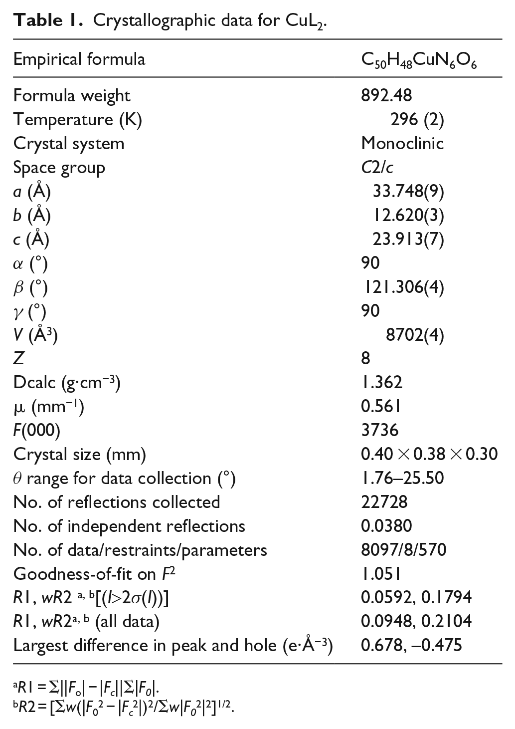 To a stirred solution of HL (0.20 mmol, 83.1 mg) in methanol (5 mL) and acetone (5 mL), Cu(NO3)3⋅3H2O (0.1 mmol, 24.2 mg) was added in methanol (5 mL). The resulting yellow solution was evaporated at room temperature. Crystals suitable for X-ray diffraction studies were obtained after several days. Yield: 53%. Anal. calcd for C50H48CuN6O6 (%): C, 67.29; H, 5.42; N, 9.42. Found (%): C, 67.33; H, 5.44; N, 9.46. IR (KBr; ν, cm−1): 1151 ν(C–N–C), 1352 ν(C–O), 1618 ν(C=N), 1685 ν(C=O). UV-Vis (DMF, λmax, nm): 271, 343, 435. ESI-MS ([Cu(L)2+H+]+): m/z = 893.39.