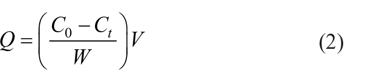 First, samples of the doped ion sieve (0.1 g) were placed in aqueous Li+ solutions (100 mL, pH = 12) having different lithium salt concentrations (20, 40, 60, 80, 100, 120, and 140 mg L−1) and stirred in a water bath at 25 °C for 24 h. After standing, the supernatant was extracted at intervals, and the Li+ concentration in the supernatant was determined via ion chromatography. The data were then fitted to the Langmuir and Freundlich adsorption isotherms, as given by equations (3) and (4), respectively