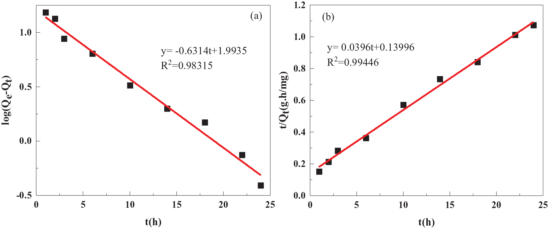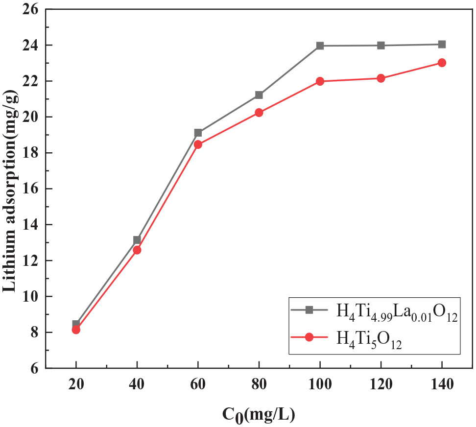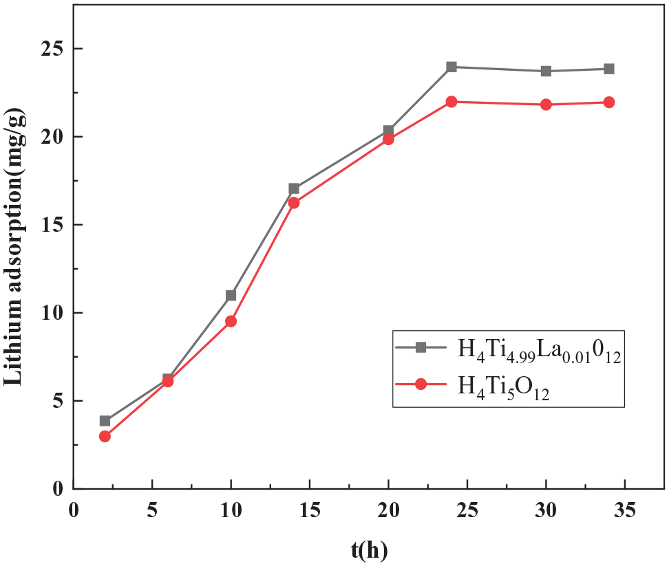 Next, we assessed the mode of adsorption of lithium ions by the ion sieves by analyzing their adsorption kinetics. Figure 10 shows the kinetics of Li+ adsorption for the H4Ti5O12 and H4Ti4.99La0.01O12 samples. Between 0 and 25 h, the adsorption capacity increased rapidly, subsequently plateauing because the sites for Li+ adsorption had been occupied. Therefore, the adsorption capacity of the ion sieve reached equilibrium after approximately 24 h. At this time, the saturated adsorption capacity of the H4Ti5O12 ion sieve was 21.98 mg g−1, whereas that of the H4Ti4.99La0.01O12 ion sieve was 23.96 mg g−1.