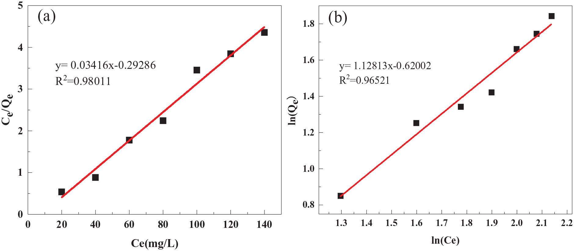 Fitting of the adsorption data to the (a) Langmuir and (b) Freundlich isotherms.