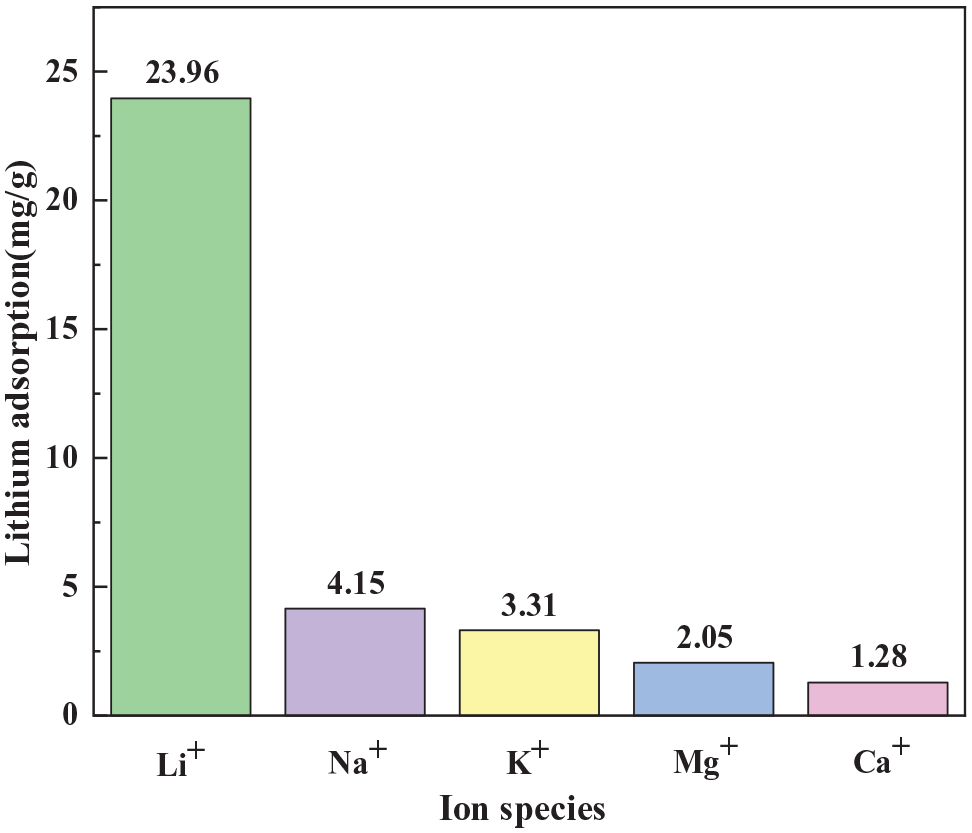 The selectivity of the ion sieves for Li+ in a solution containing equal concentrations of Li+, Na+, K+, Mg2+, and Ca2+ was next assessed, and the results are shown in Figure 14. As shown, the adsorption capacities were 23.96, 4.15, 3.31, 2.05, and 1.28 mg g−1 for Li+, Na+, K+, Mg2+, and Ca2+, respectively, demonstrating the high selectivity of the prepared ion sieve for Li+.