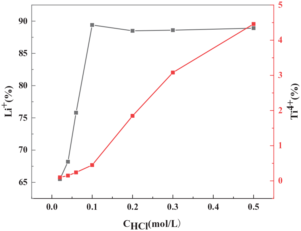 Degree of Li+ and Ti4+ leaching with respect to acid concentration.