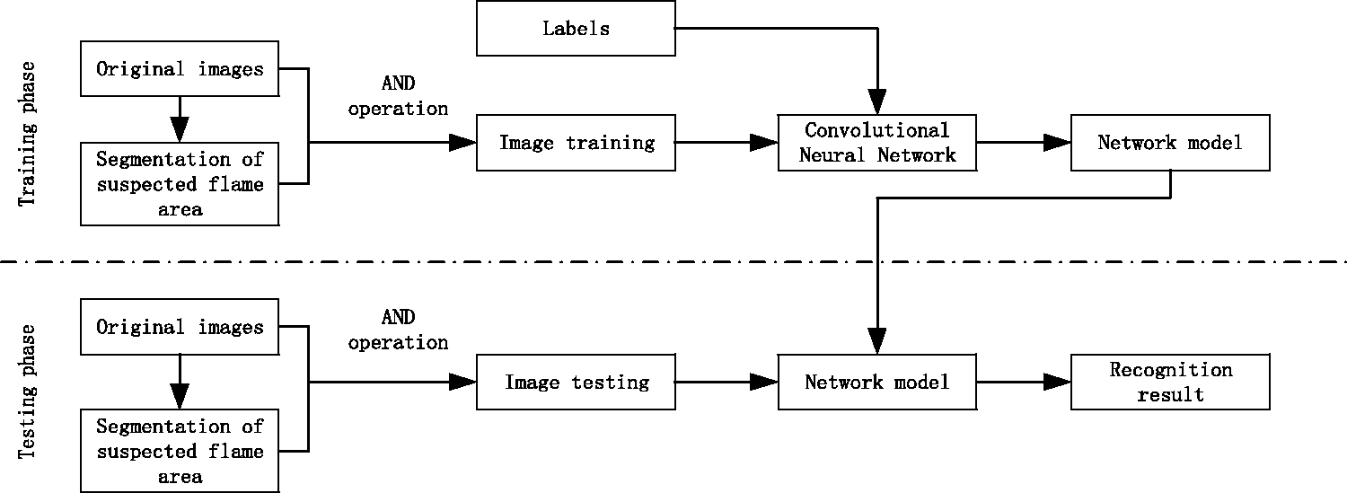 In the training phase, firstly, the binary image of the suspected flame region is segmented, and the result obtained by performing AND operation between the binary image and the original image is used as a training set, and a label is set for each image. A network model is obtained after training the CNN according to the training set. In the testing phase, similarly, the binary image of the suspected flame region is firstly segmented, and the result obtained by performing AND operation with the original image is used as a testing set. The testing set image is sent to the trained network model to obtain the recognition result.