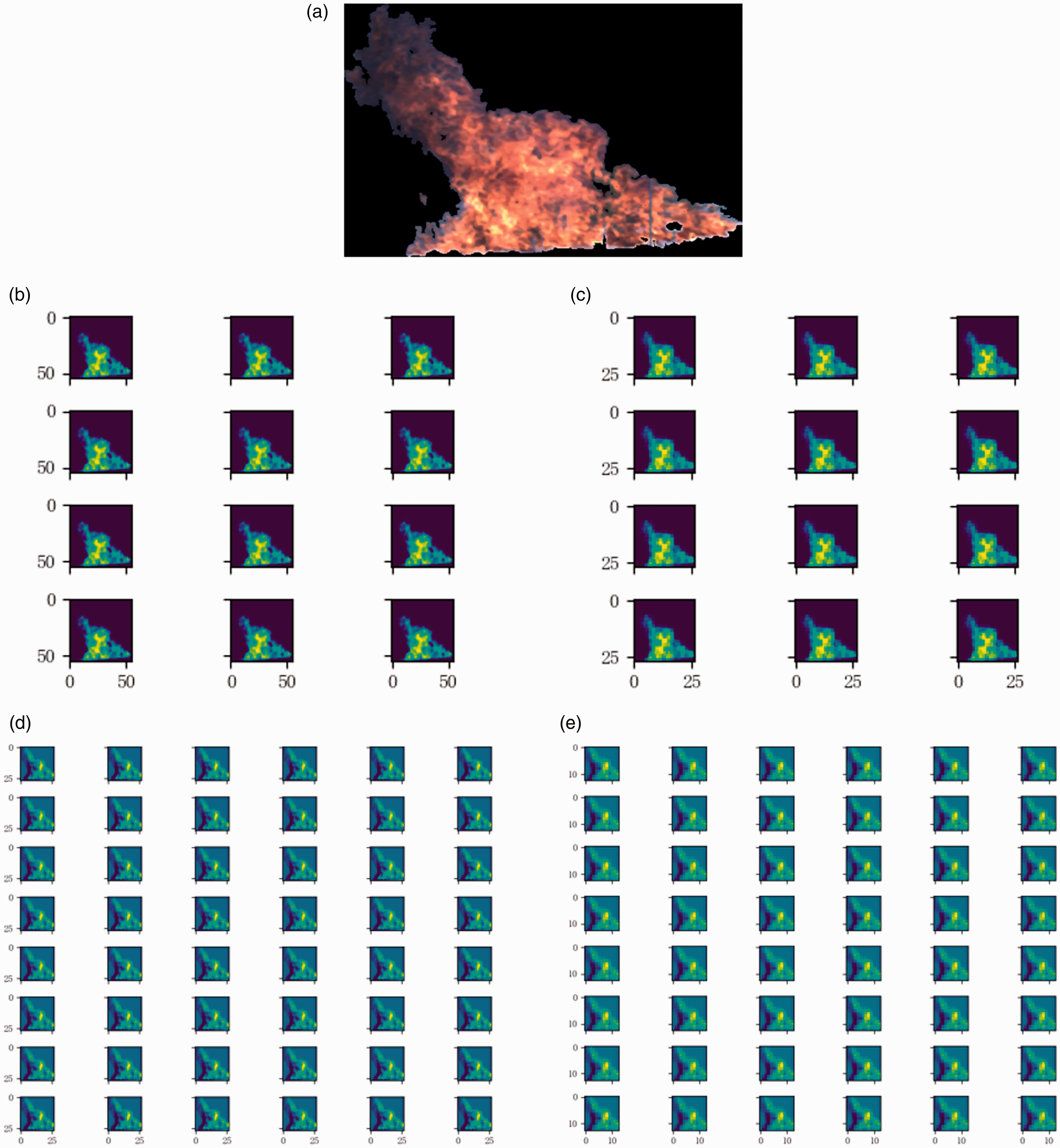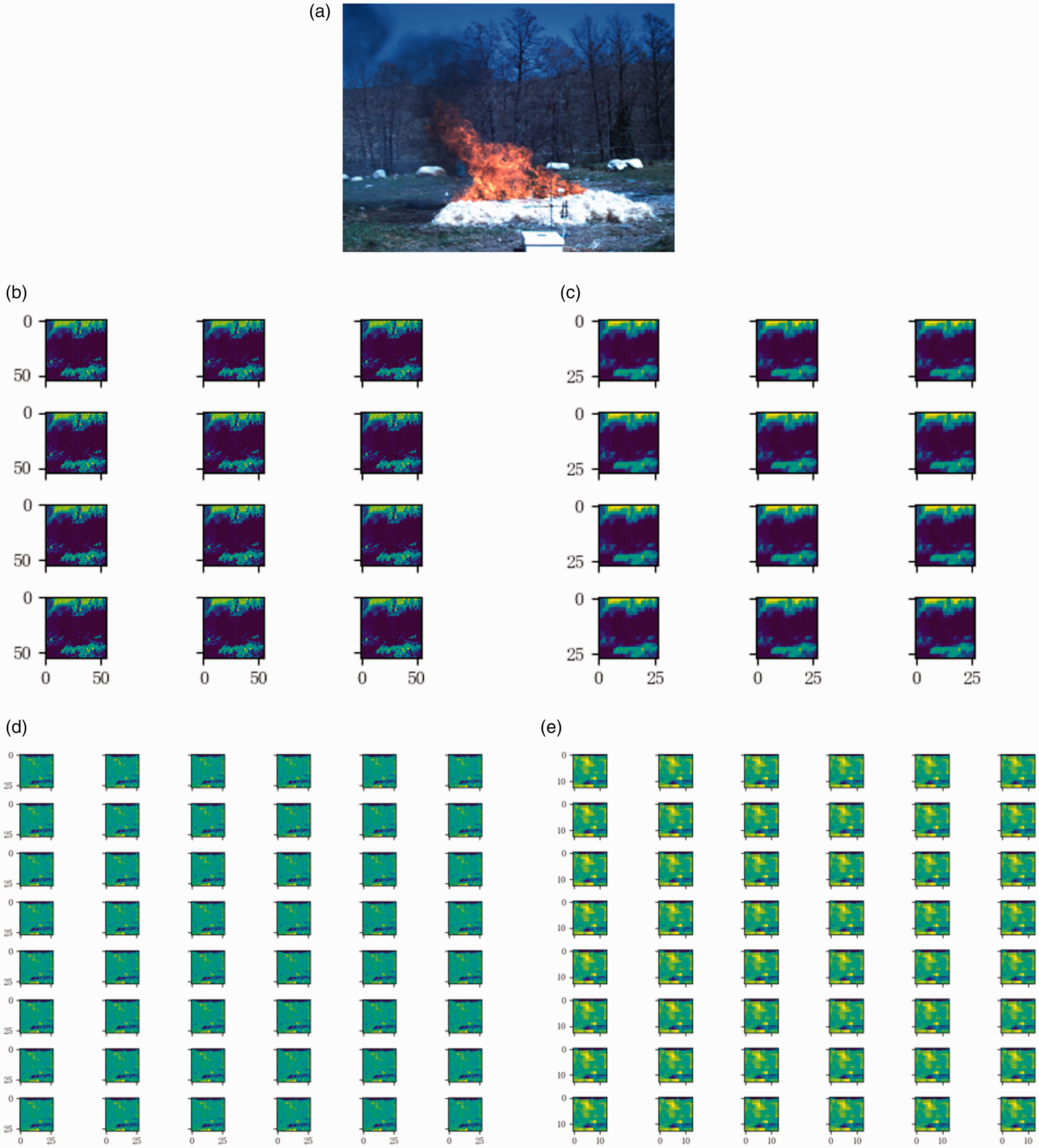 Fire image features of CNN hidden layer combined with color feature. (a) Original image. (b) Feature map with C-1. (c) Feature map with S-2. (d) Feature map with C-3. (e) Feature map with S-4.