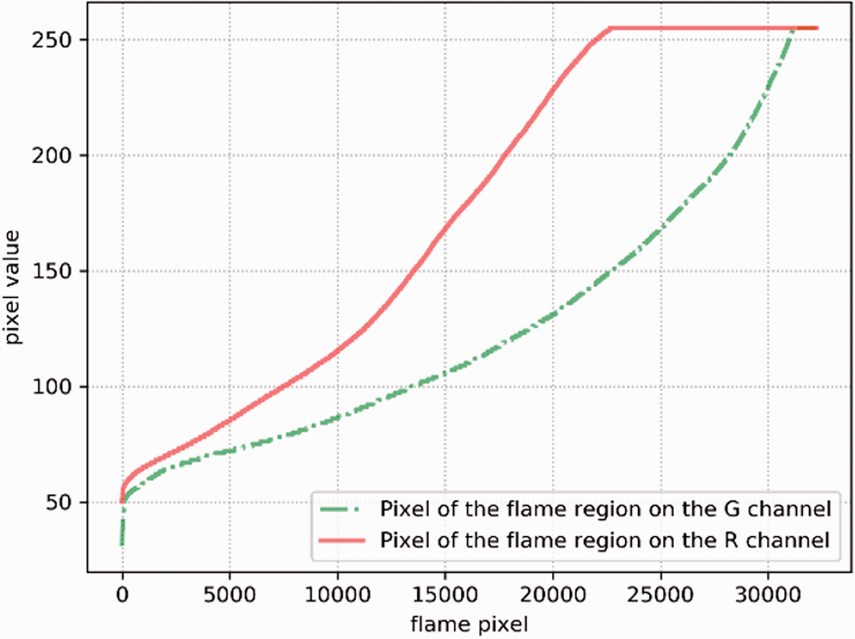 Distribution of flame pixel values on channels