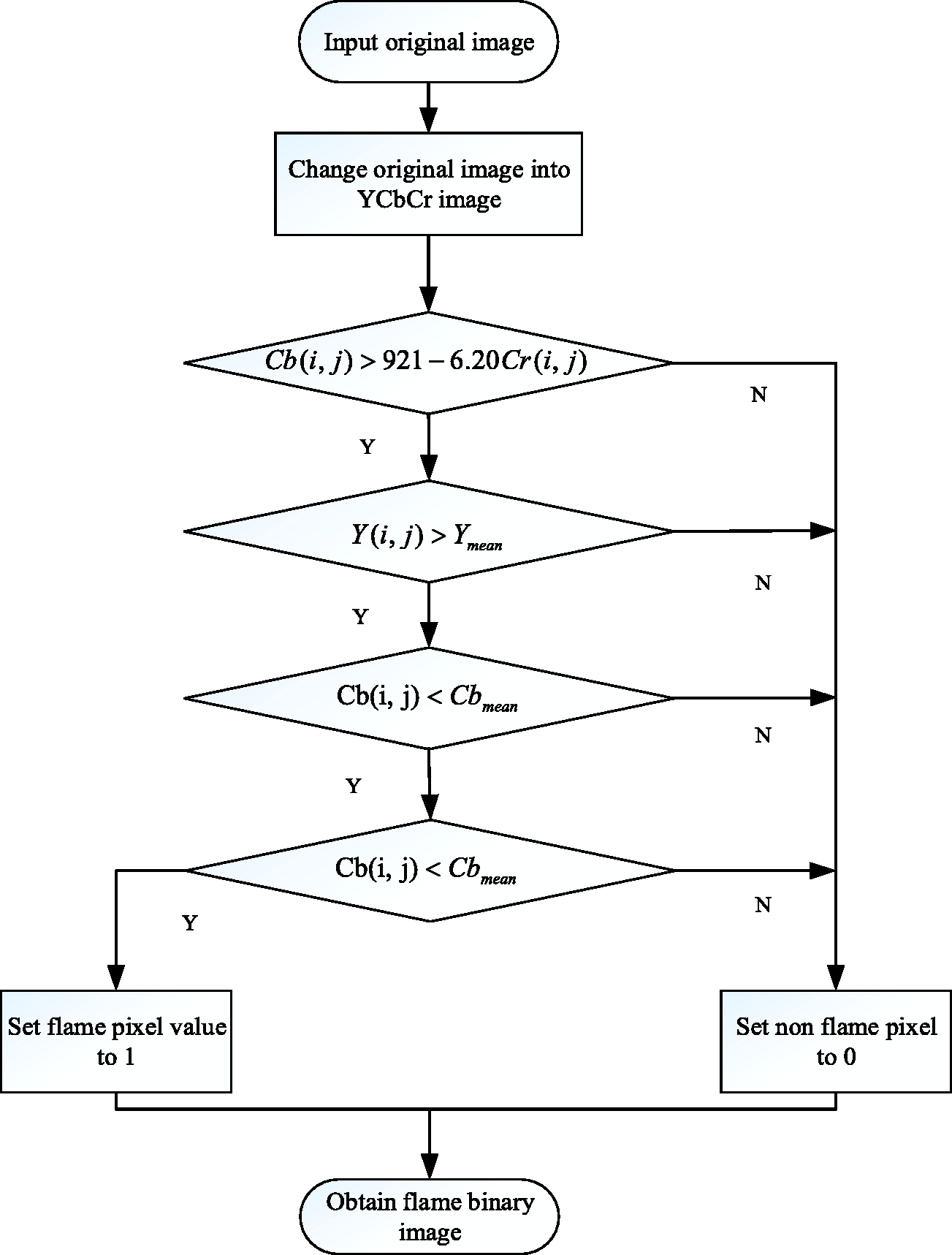 From Figure 3(a), the rule for the flame pixel in YCbCr color space as shown in equation (2) can be found
