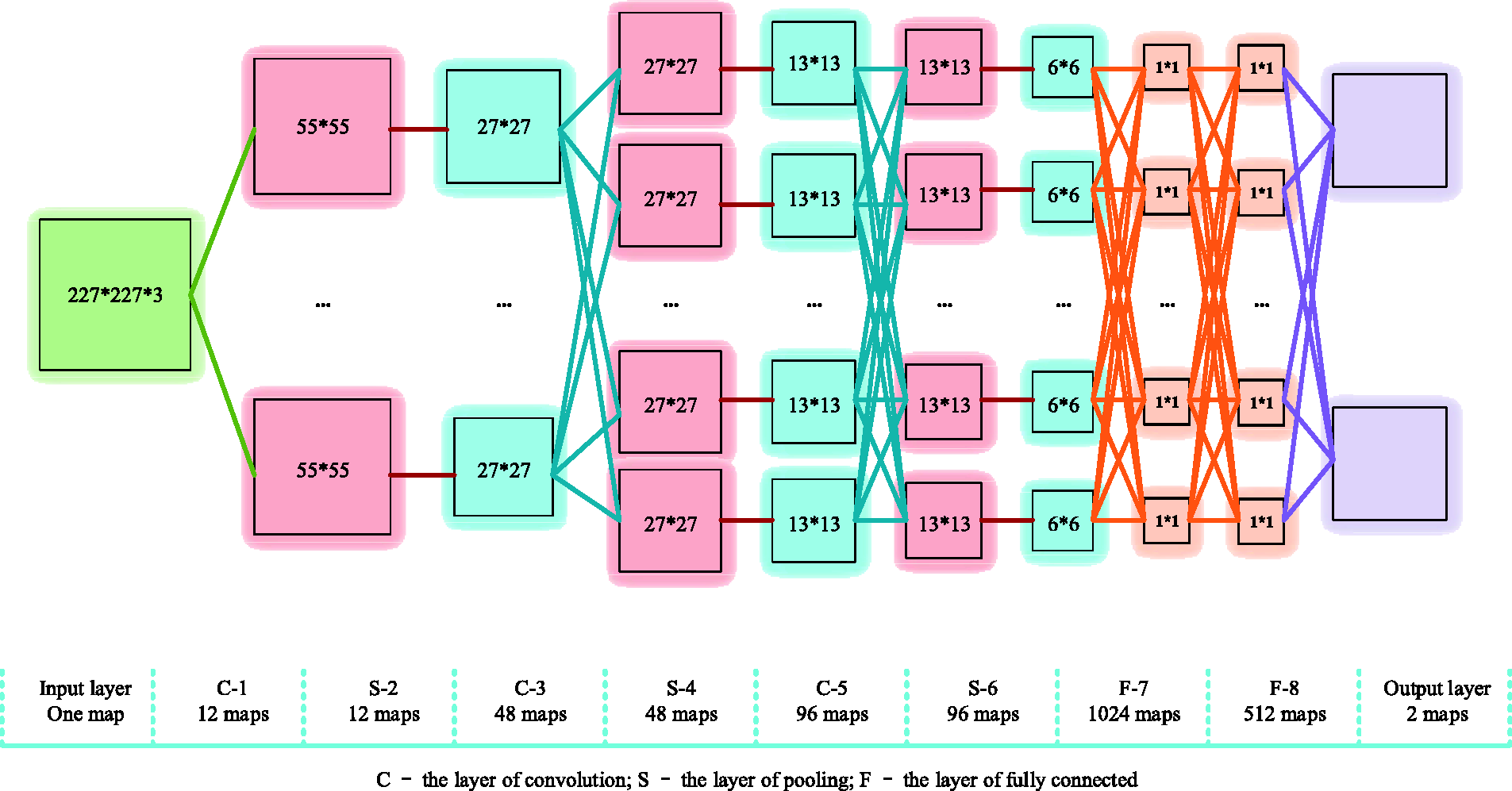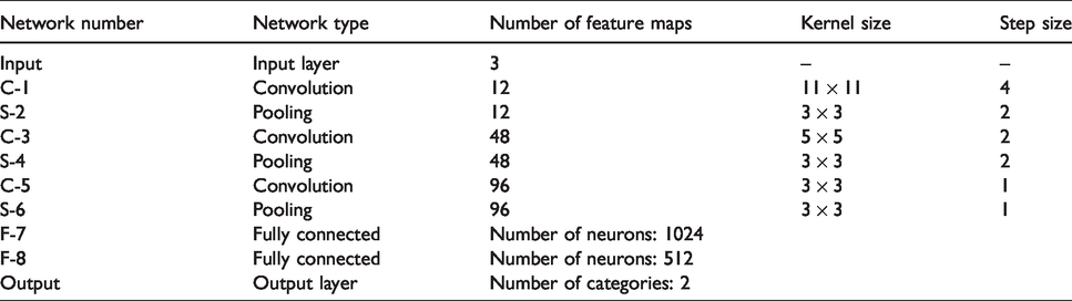 In this paper, a CNN model is designed based on the AlexNet to recognize flame area. Specifically, it consists of three convolution layers, three pooling layers, two fully connected layers, plus one input layer and output layer. The network is shown in Figure 5, and the network structure is shown in Table 1.