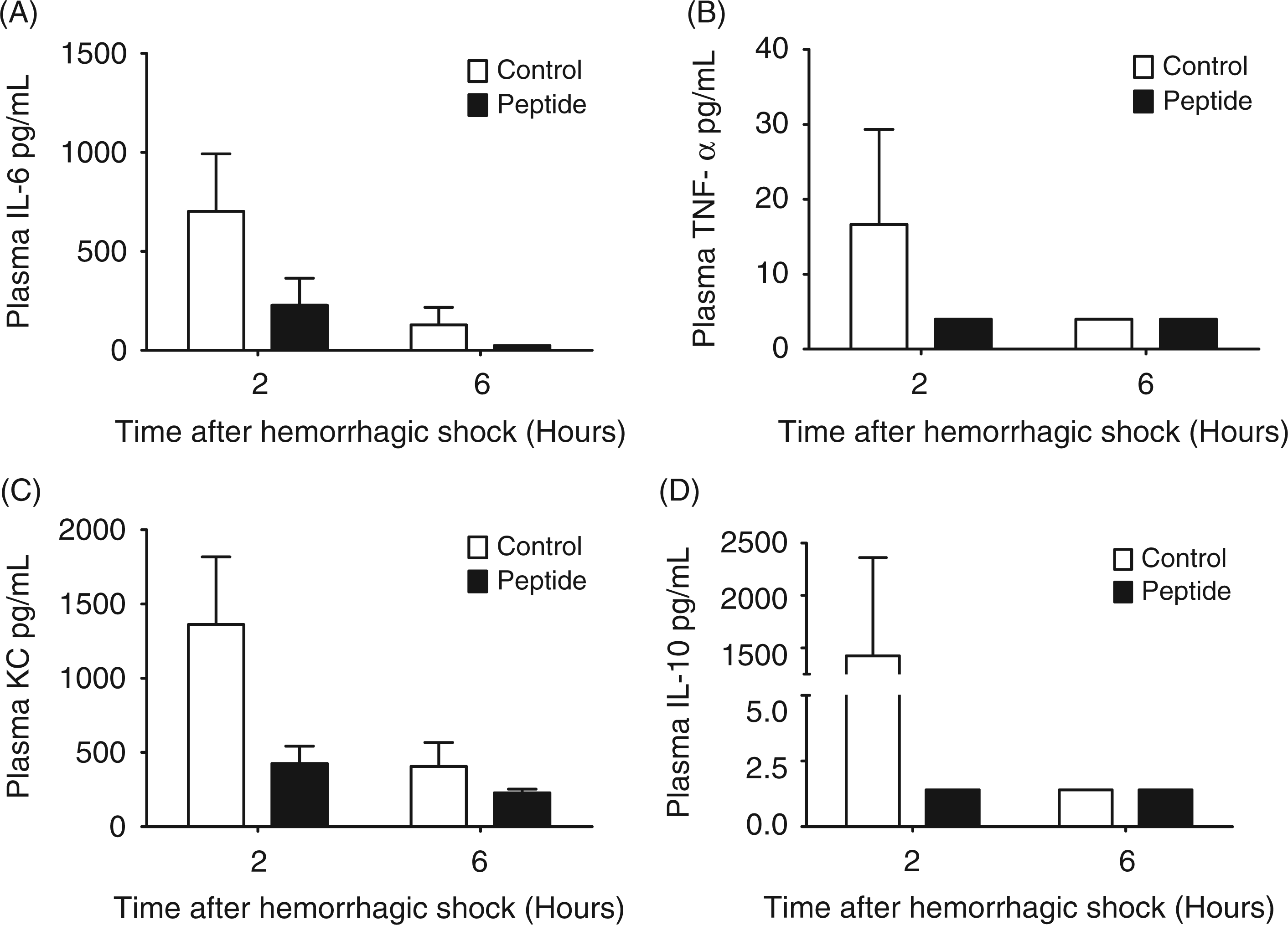 In order to determine the systemic inflammatory response post-hemorrhage/reperfusion injury, we measured a panel of pro- and anti-inflammatory cytokines and chemokines (Figure 4). Plasma cytokine levels were greatest at 2 h post-hemorrhagic shock. Peptide treatment reduced the mean cytokine concentrations of the pro-inflammatory cytokines (TNF-α, IL-6 and CXCL1/KC), although the results were not significantly different from controls—likely because of variability between animals. The peptide-treated group also showed a trend toward reduction of the anti-inflammatory cytokine, IL-10.