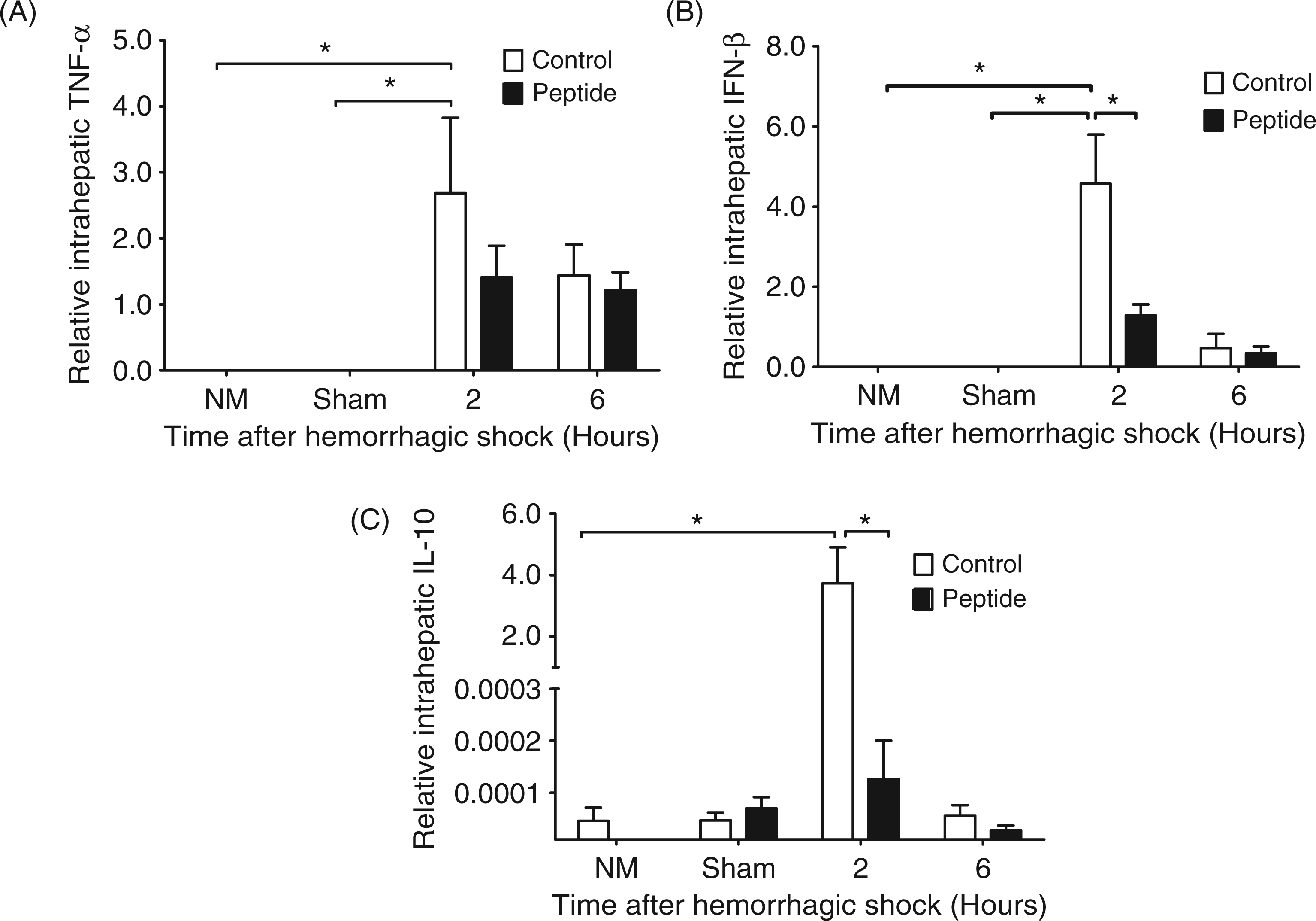 In order to examine the hepatic inflammatory response to hemorrhagic shock, we examined intrahepatic RNA expression of cytokines produced by the MyD88 dependent (TNF-α) and MyD88 independent pathways (IFN-β). We found that, similar to the systemic response, cytokine expression was greatest at 2 h post-hemorrhagic shock and had declined by 6 h. Administration of peptide resulted in a significant decrease in the expression of the MyD88 independent cytokine IFN-β ( Relative messenger RNA levels of intrahepatic cytokine expression after hepatic hemorrhage/reperfusion injury. Groups of mice underwent no manipulations (