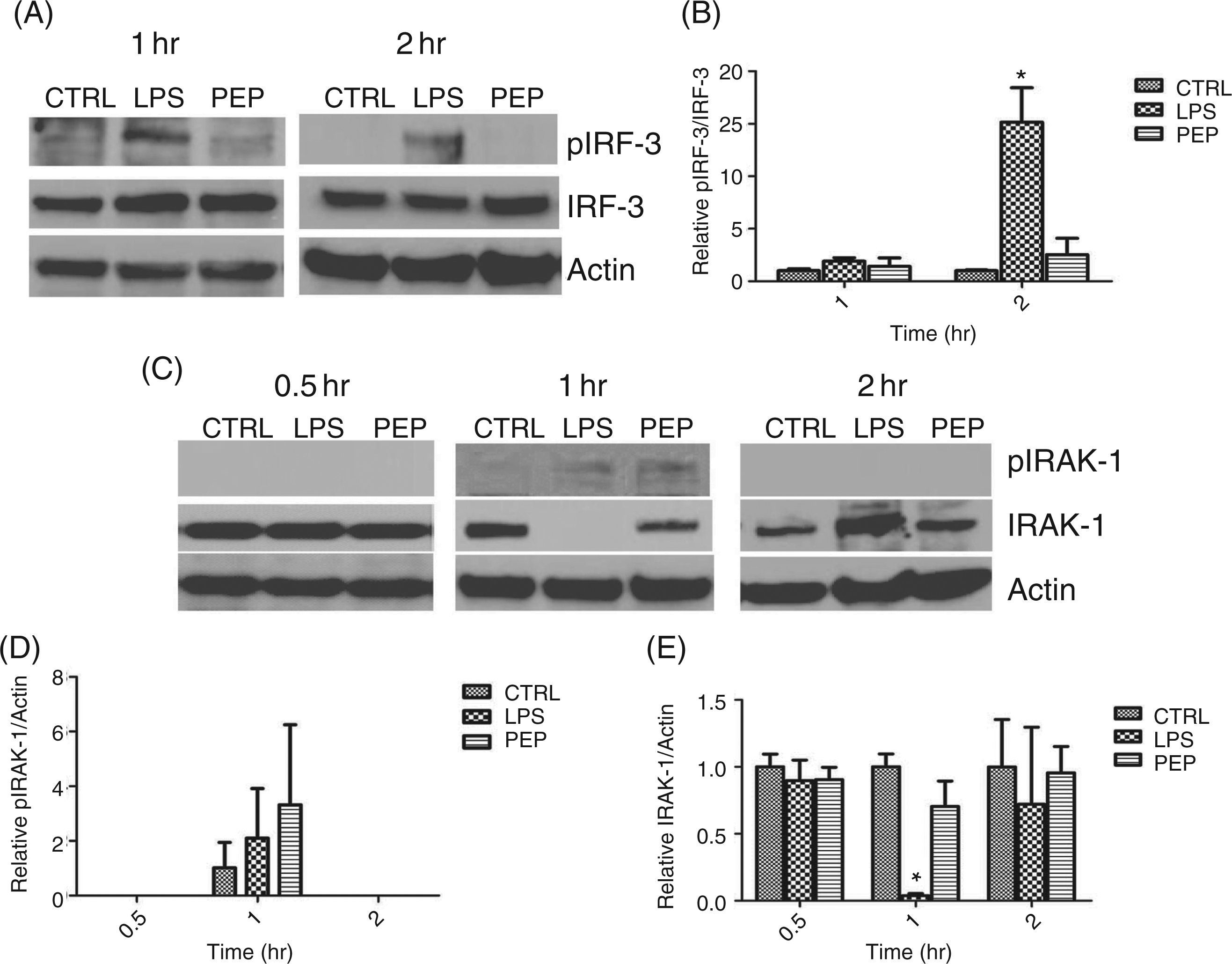 Differential effect of LBP peptide on LPS activation of MyD88 dependent and independent pathways in RAW 264.7 cells. RAW 264.7 cells cultured in 1% wild type (C57BL/6) serum and stimulated with either control media (CTRL), 10 ng/ml of LPS (LPS) or LPS with 80 µg/ml of LBP inhibitory peptide (PEP). (A) Representative immunoblots of phosphorylated IRF-3 (pIRF-3), IRF-3 (IRF-3) or actin (Actin) 1 and 2 h after stimulation. (B) Densitometry of pIRF-3/IRF-3 at 1 and 2 h after stimulation (*