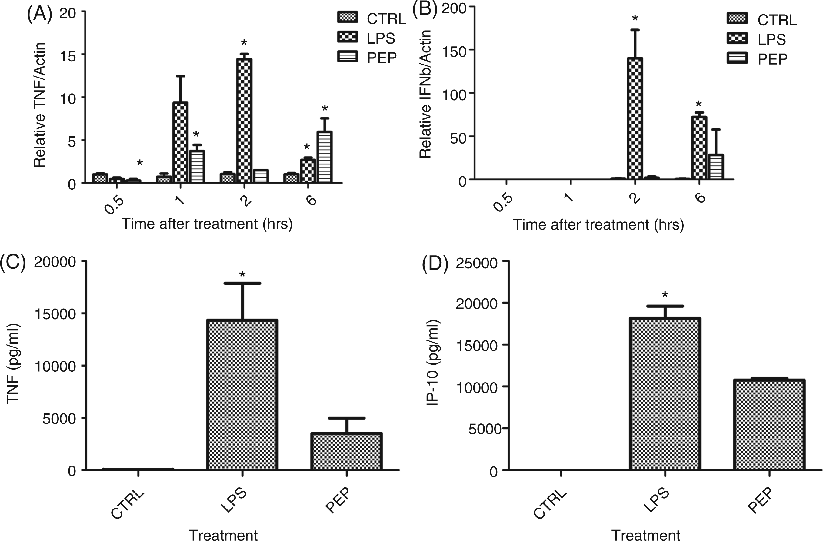 Cytokine expression by RAW 267.4 cells after stimulation with LPS. RAW 264.7 cells cultured in 1% wild type (C57BL/6) serum and stimulated with either control media (CTRL), 10 ng/ml of LPS (LPS) or LPS with 80 µg/ml of LBP peptide (PEP). (A) Relative expression of TNF-α by RAW 264.7 cells was measured with real-time PCR at 0.5, 1,2, or 6 h after stimulation (*