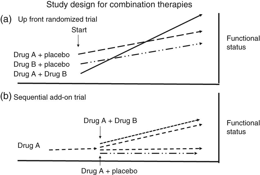 (A) Proper testing of the efficacy of a combination of two therapies requires three arms. One tests the efficacy of the first drug alone, the second arm tests the efficacy of the other agent alone and the third arm tests the efficacy of the two drugs together