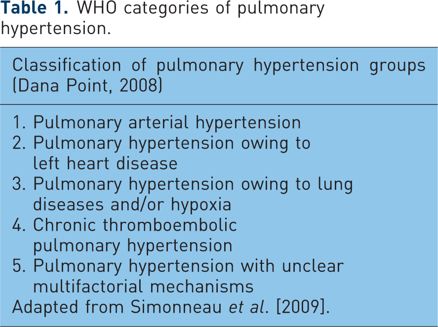 The most common form of PH occurs as a result of left-sided heart failure or valvular heart disease. These conditions raise pulmonary arterial pressure predominantly by elevating pulmonary venous pressure and are referred to as PH owing to left heart disease (WHO group 2). PH is also prevalent in many chronic lung diseases such as COPD, interstitial lung disease and obstructive sleep apnea. These forms of PH tend to be mild and comprise WHO group 3. While most cases correlate with the extent of underlying lung disease there is a subgroup of patients in group 3 with PH out of proportion to their underlying lung disease. WHO group 4 is reserved for patients with pulmonary embolic disease, such as chronic thromboembolic pulmonary hypertension (CTEPH). The last grouping, WHO group 5, includes PH that has been described with a variety of miscellaneous diseases where the pathogenetic mechanism is unclear such as sarcoidosis, disorders of glycogen storage and thyroid disease. For this review, PAH refers to those types of PH in WHO group 1.
