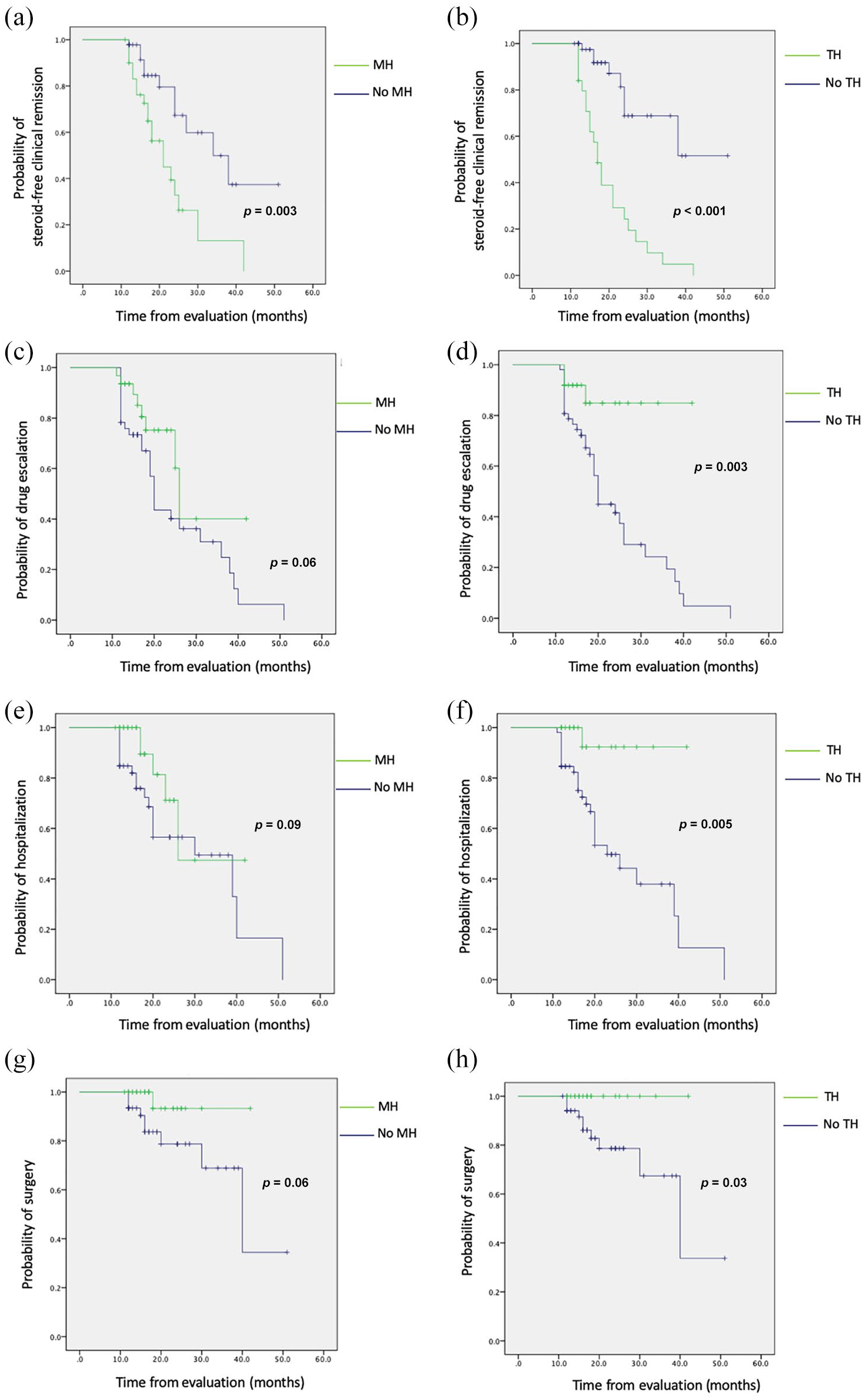 Cumulative survival rates with long-term outcomes of mucosal healing (MH) and transmural healing (TH). (a) and (b) Steroid-free clinical remission. (c) and (d) Drug escalation. (e) and (f) Crohn’s disease (CD)-related hospitalization. (g) and (h) CD-related surgery.