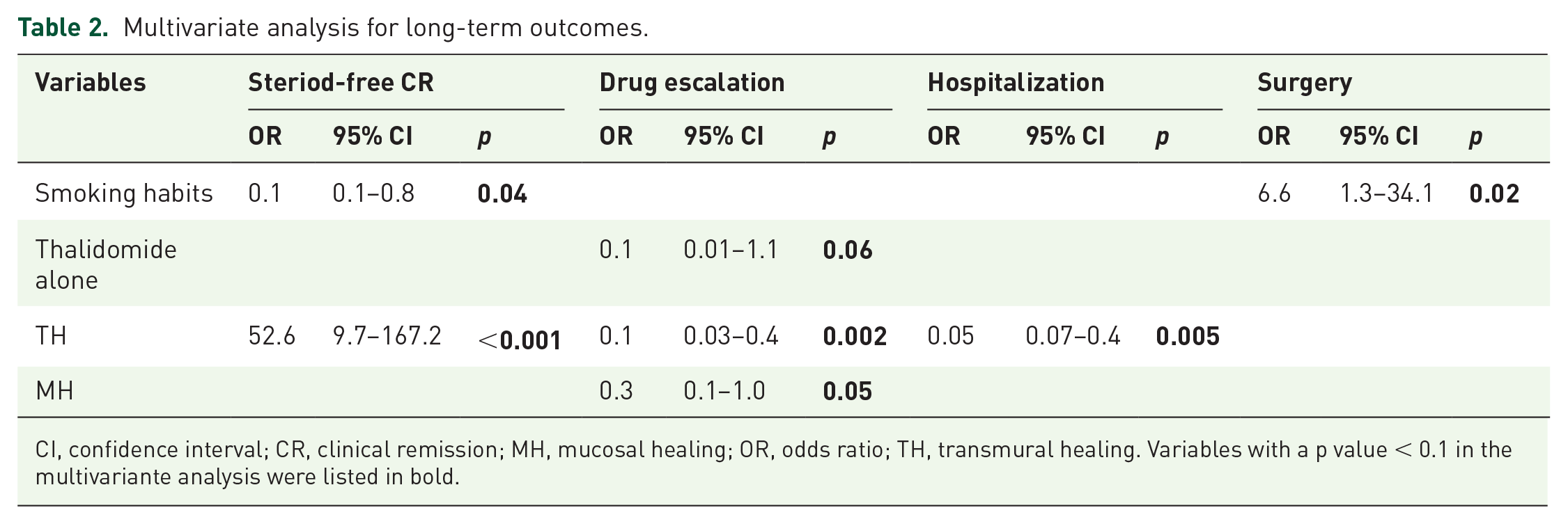 CI, confidence interval; CR, clinical remission; MH, mucosal healing; OR, odds ratio; TH, transmural healing. Variables with a p value < 0.1 in the multivariante analysis were listed in bold.