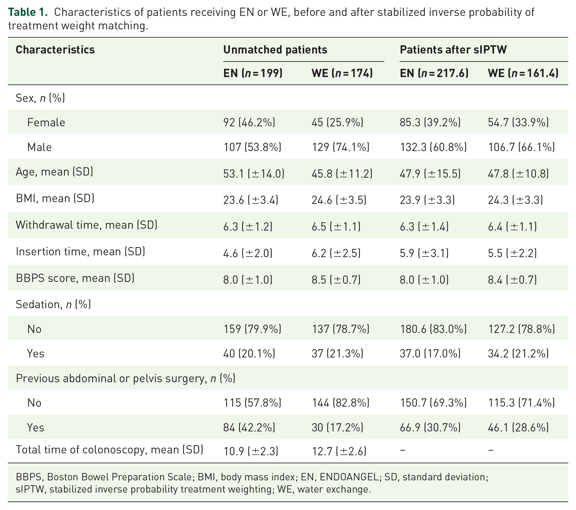 BBPS, Boston Bowel Preparation Scale; BMI, body mass index; EN, ENDOANGEL; SD, standard deviation; sIPTW, stabilized inverse probability treatment weighting; WE, water exchange.