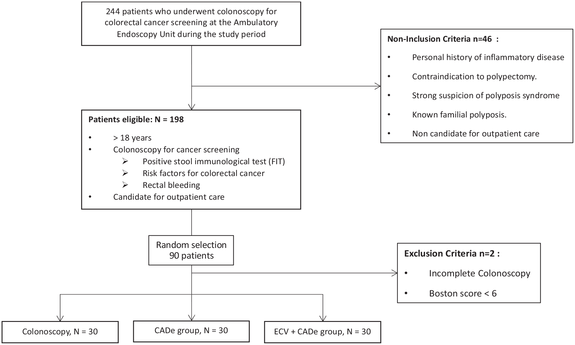 From April to June 2021, 244 patients underwent screening colonoscopy. 198 were eligible, and after randomization, 90 patients were included across three groups (colonoscopy