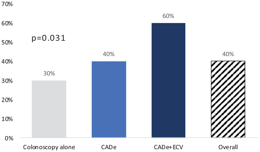 The ADR was significantly higher in the CADe + ECV coupled group: 60% ± 5, compared to 40% ± 5 in the CADe-assisted colonoscopy group and 30% ± 5 in the colonoscopy group (